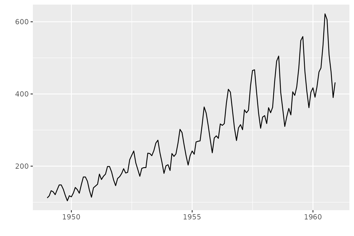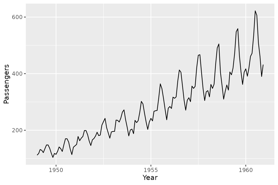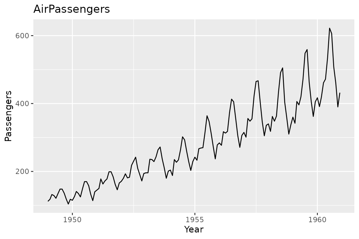 autoplot(AirPassengers, title = 'AirPassengers', xlab = 'Year', ylab = 'Passengers')