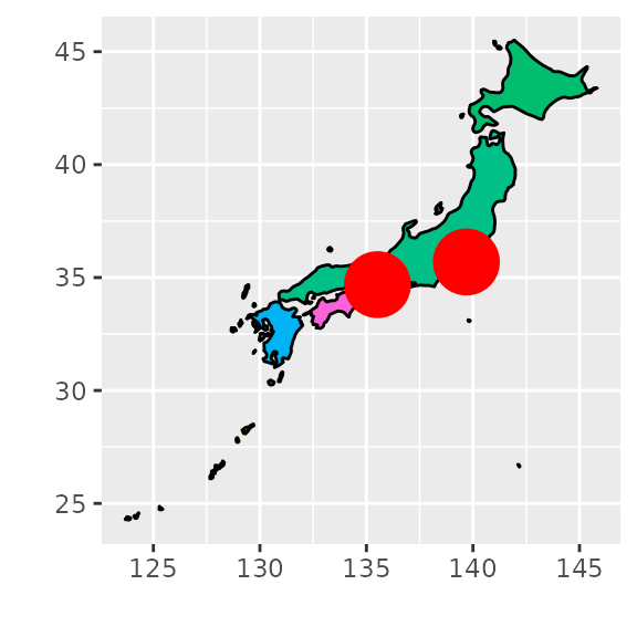 Following example creates SpatialPointsDataFrame of some Japanese city’s populatios, then plot it via autoplot. Note that you geom is specified by the original sp class. SpatialPoints is plot using geom_point for example.