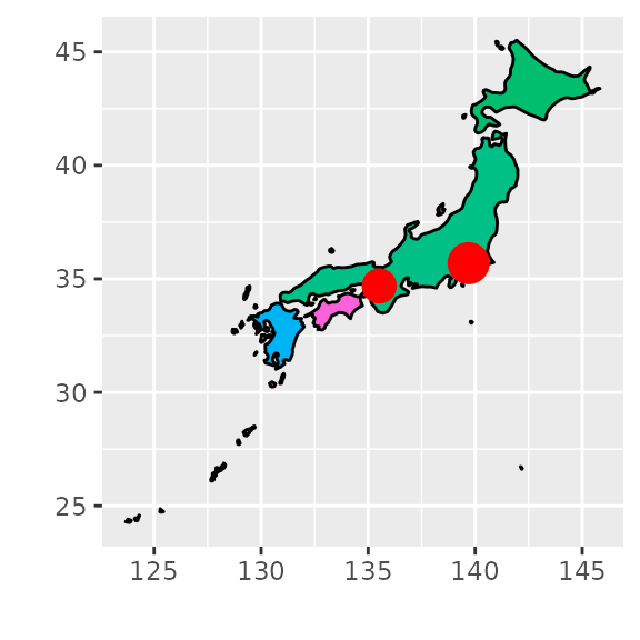 Also, maps package provides some geospatial data. Following example retrieves Japanese city locations from world’s city locations. Then plot on the previous map.