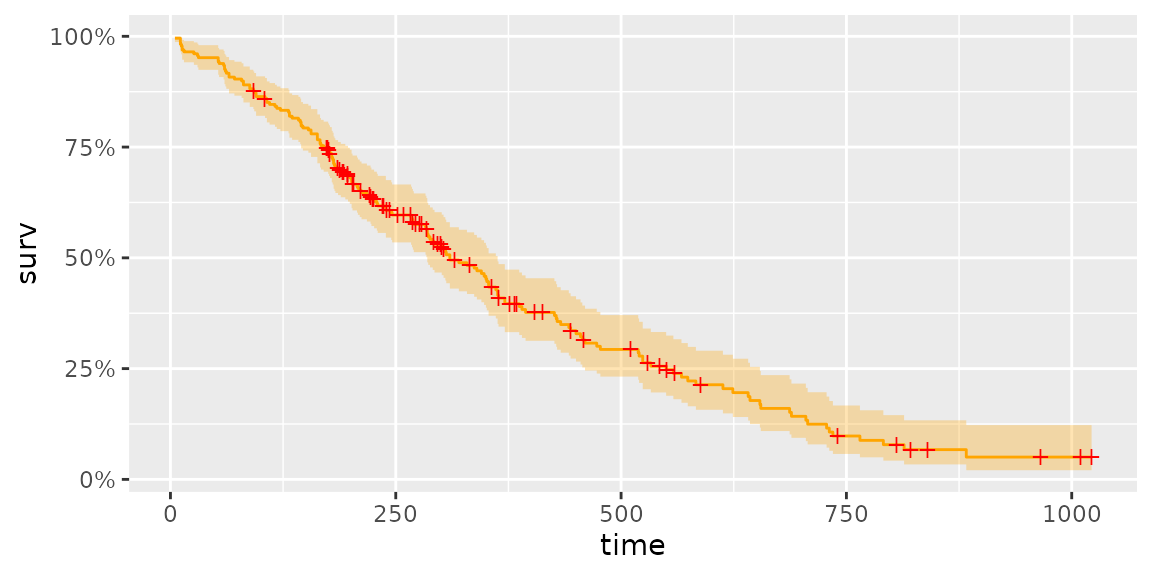 autoplot(survfit(Surv(time, status) ~ 1, data = lung), surv.colour = 'orange', censor.colour = 'red')