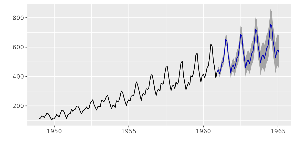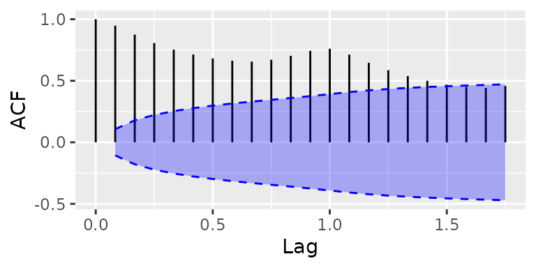 autoplot(acf(AirPassengers, plot = FALSE), conf.int.fill = '#0000FF', conf.int.value = 0.8, conf.int.type = 'ma')