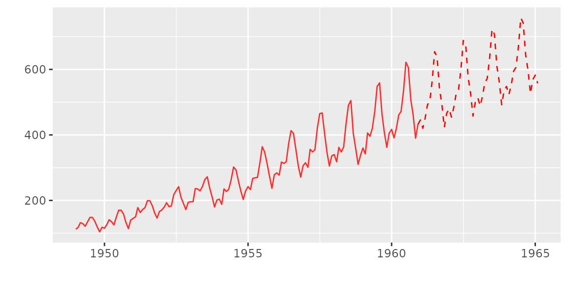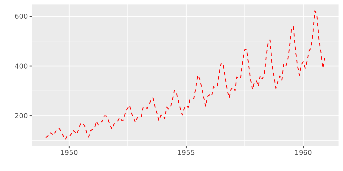 autoplot(AirPassengers, ts.colour = 'red', ts.linetype = 'dashed')