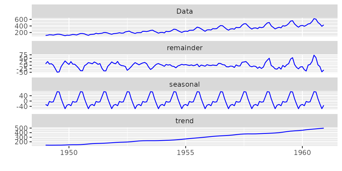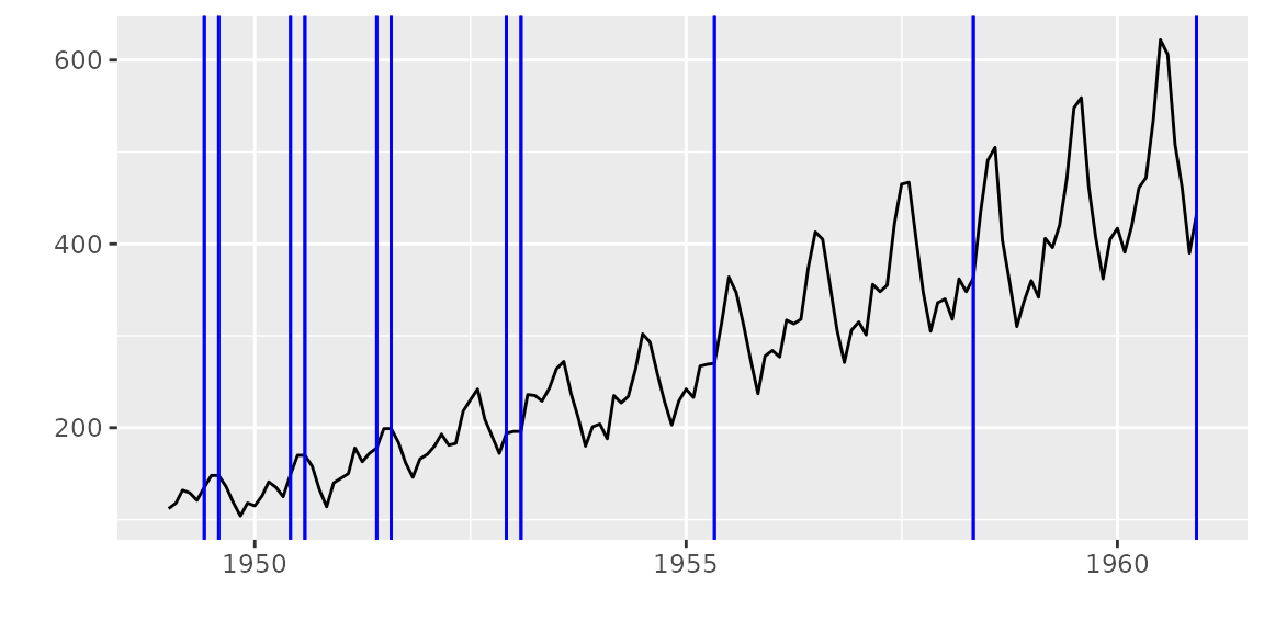 autoplot(cpt.meanvar(AirPassengers), cpt.colour = 'blue', cpt.linetype = 'solid')