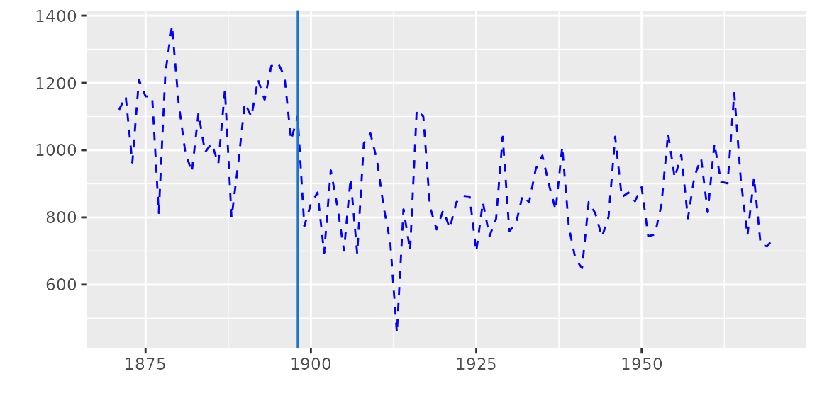 autoplot(breakpoints(Nile ~ 1), ts.colour = 'blue', ts.linetype = 'dashed',