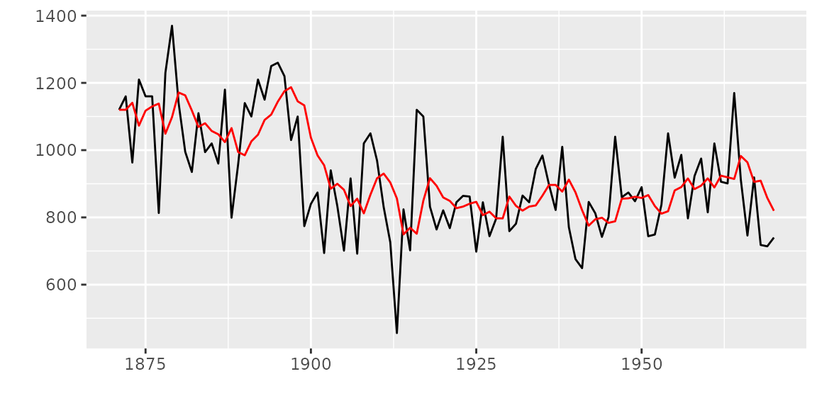 Nile ~ SSMtrend(degree=1, Q=matrix(NA)), H=matrix(NA)