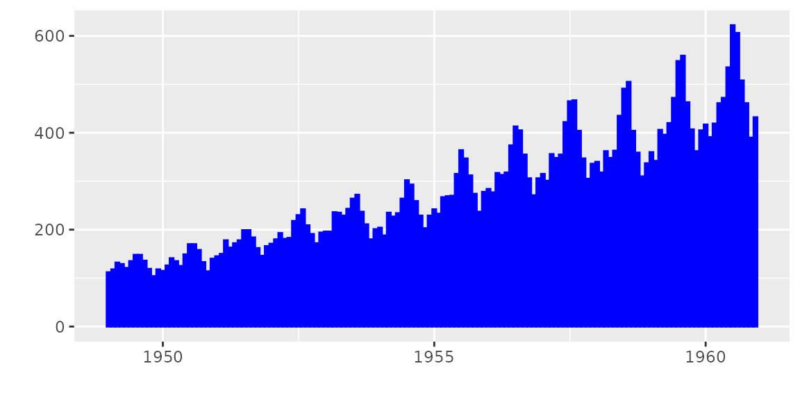 autoplot(AirPassengers, ts.geom = 'bar', fill = 'blue')