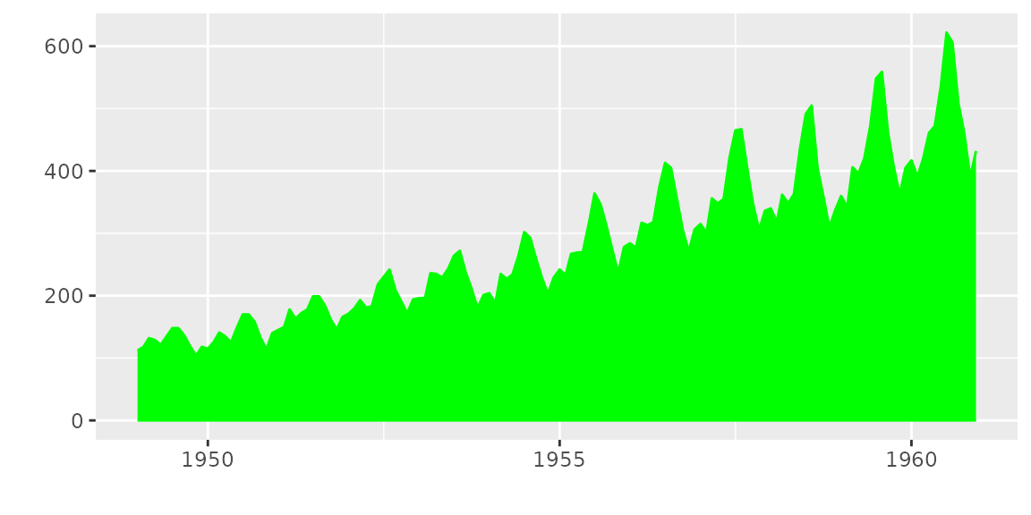 autoplot(AirPassengers, ts.geom = 'ribbon', fill = 'green')