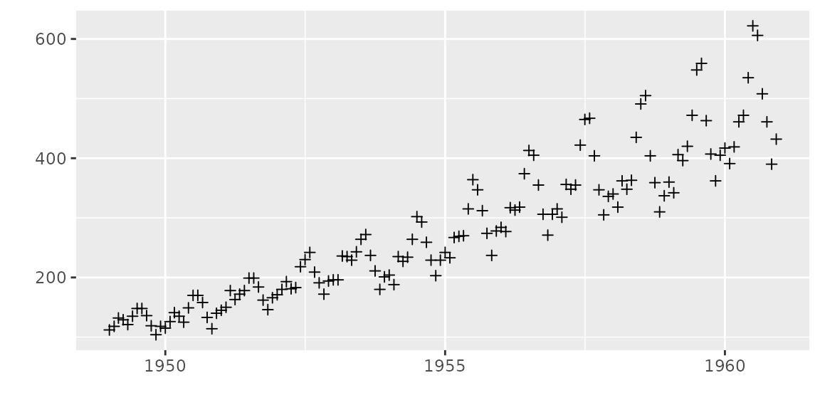 autoplot(AirPassengers, ts.geom = 'point', shape = 3)