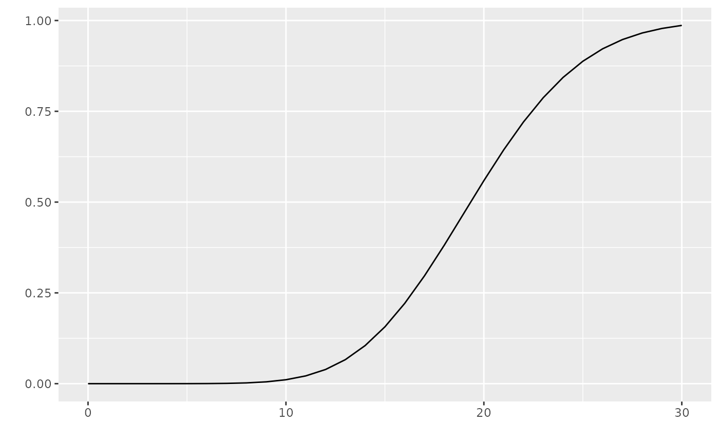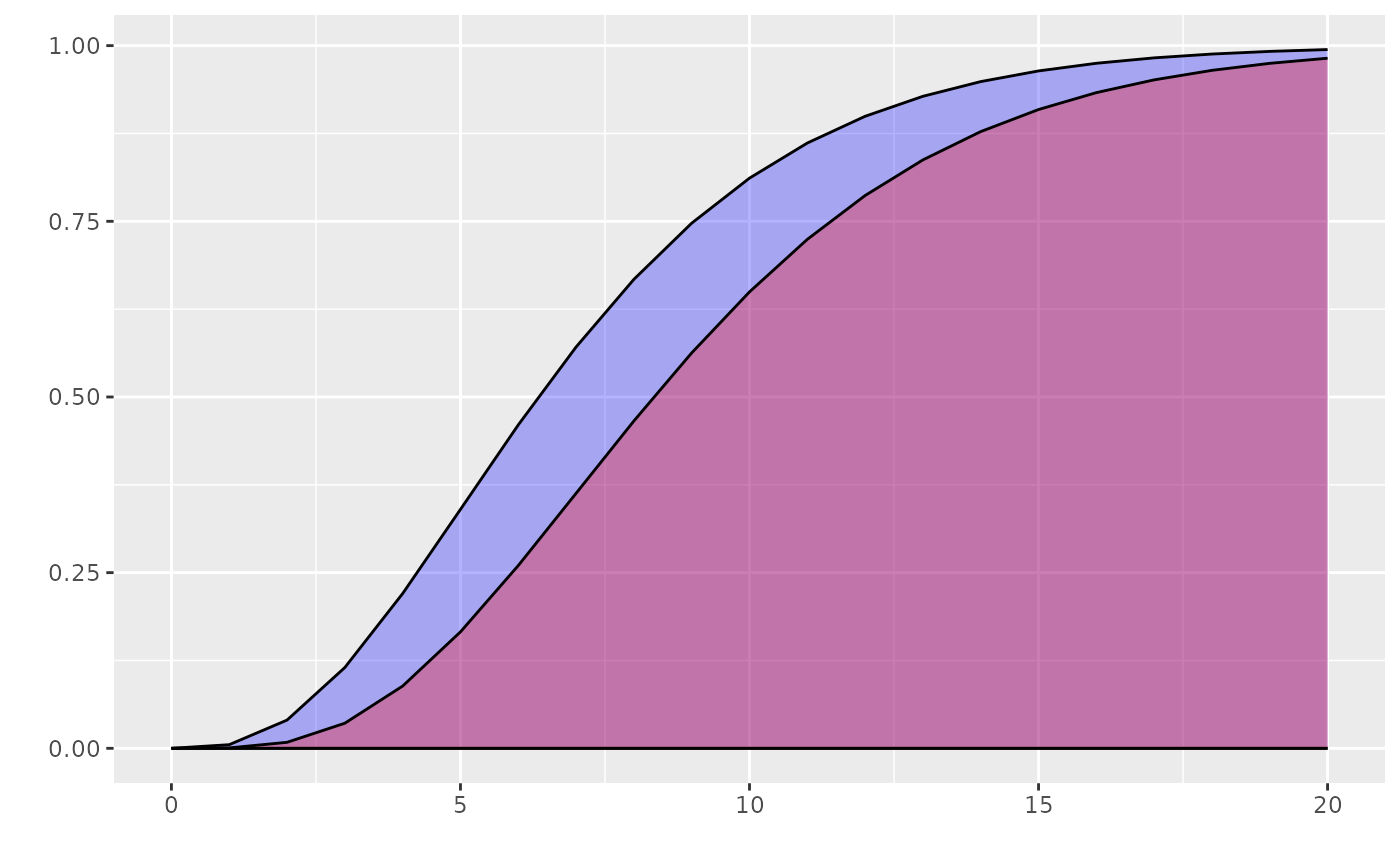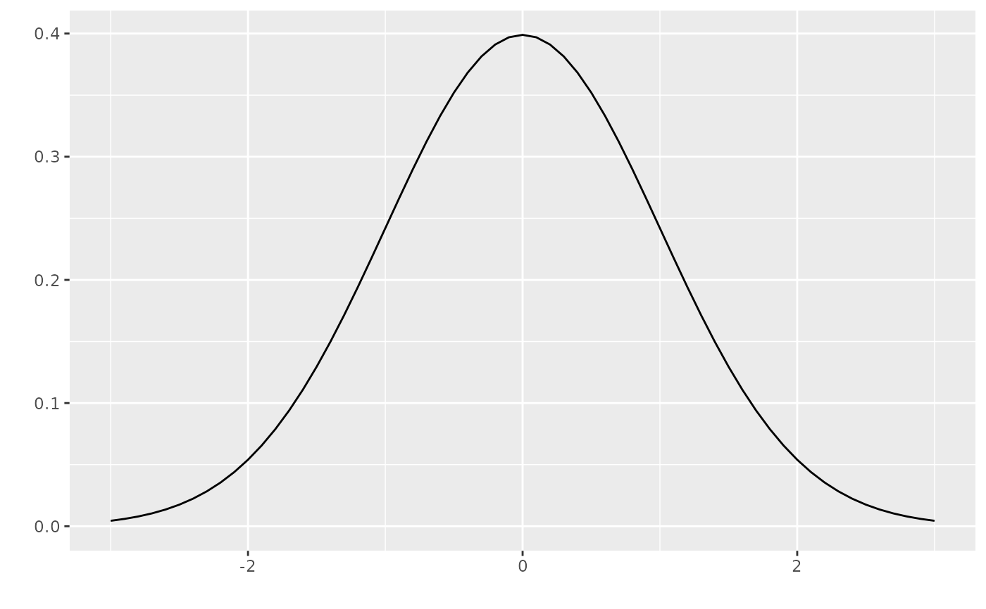 ggdistribution(dnorm, seq(-3, 3, 0.1), mean = 0, sd = 1) ggdistribution(ppois, seq(0, 30), lambda = 20) p <- ggdistribution(pchisq, 0:20, df = 7, fill = 'blue') ggdistribution(pchisq, 0:20, p = p, df = 9, fill = 'red')