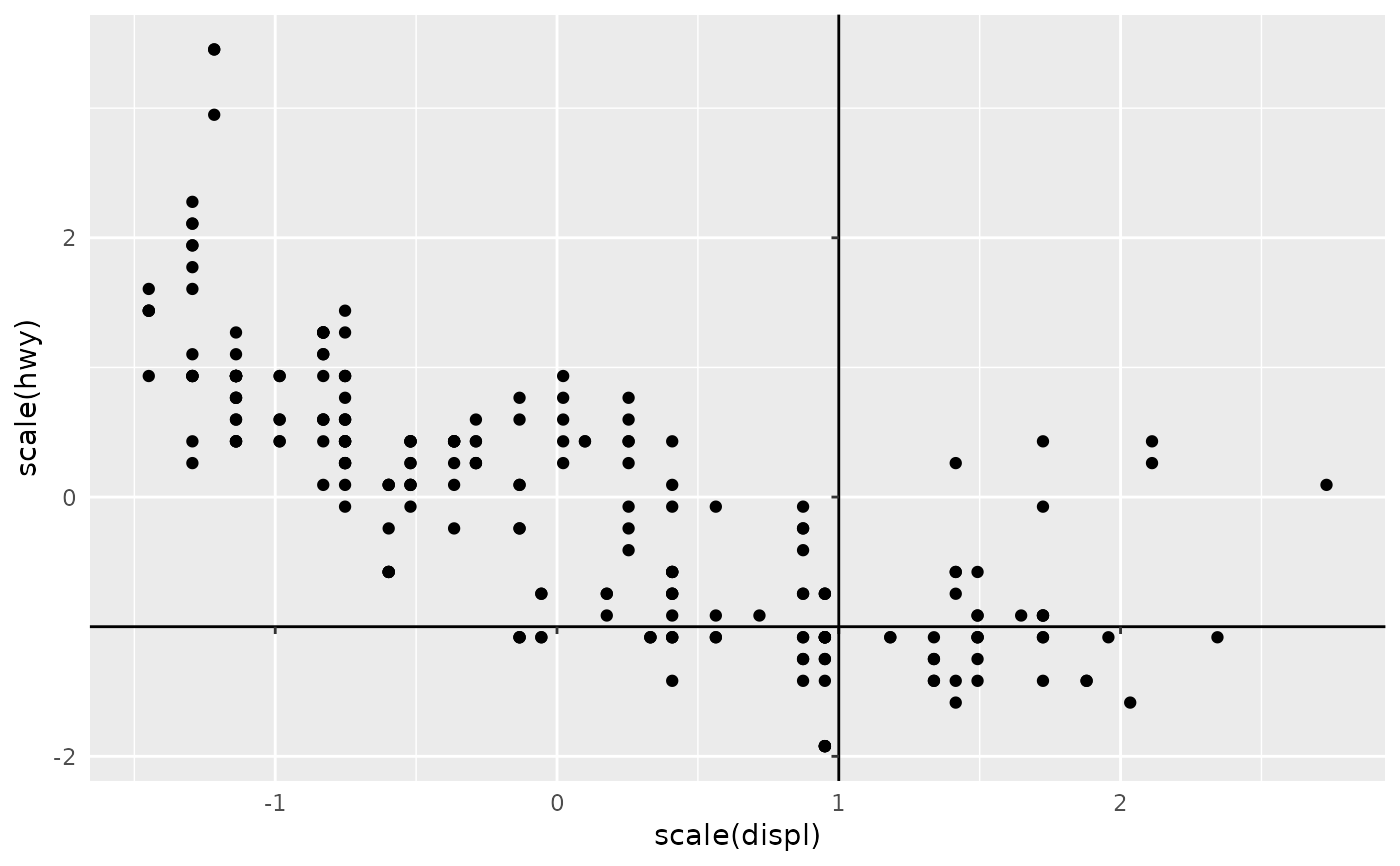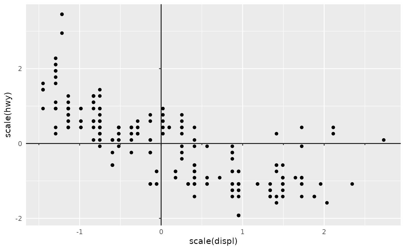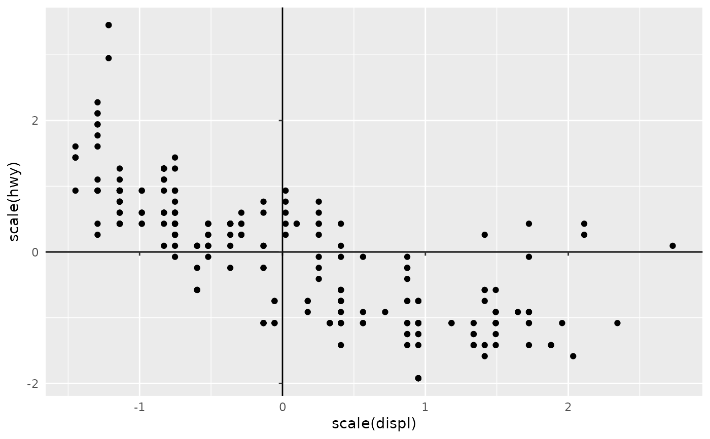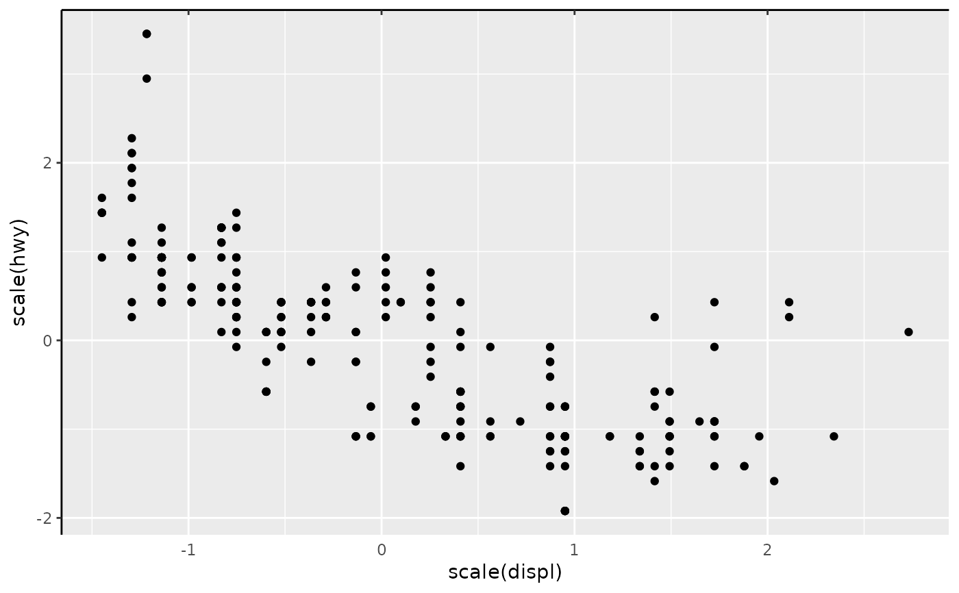 p <- ggplot(mpg, aes(scale(displ), scale(hwy))) +