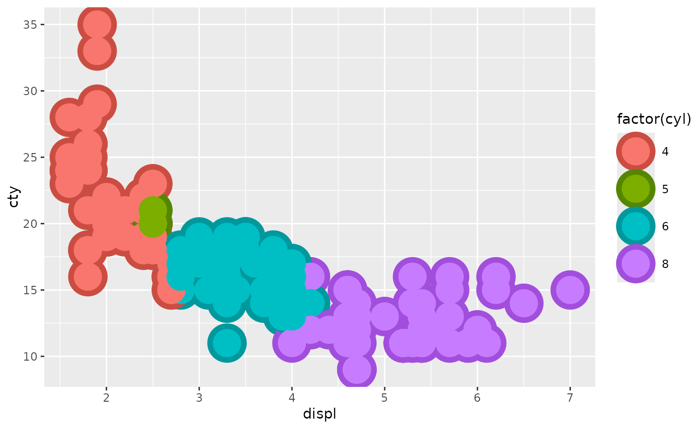 p <- ggplot(mpg, aes(displ, cty, colour = factor(cyl))) +