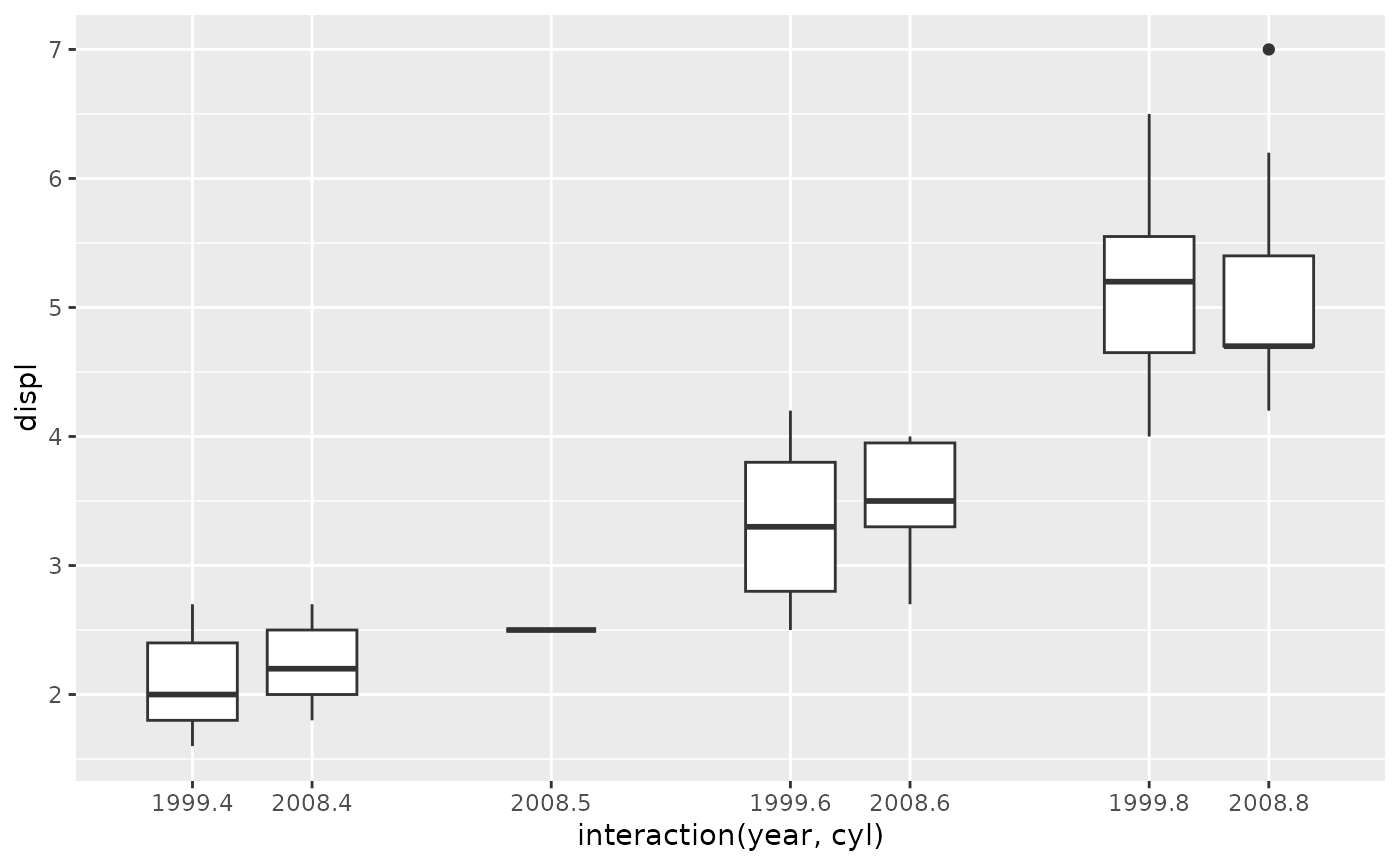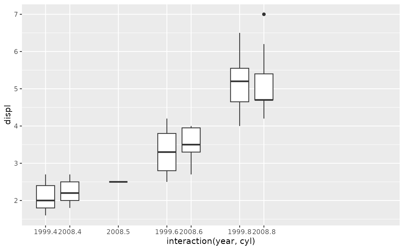 p <- ggplot(mpg, aes(interaction(year, cyl), displ)) +
