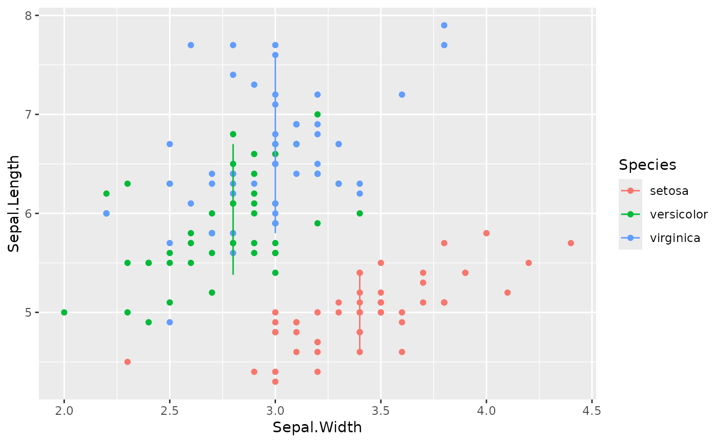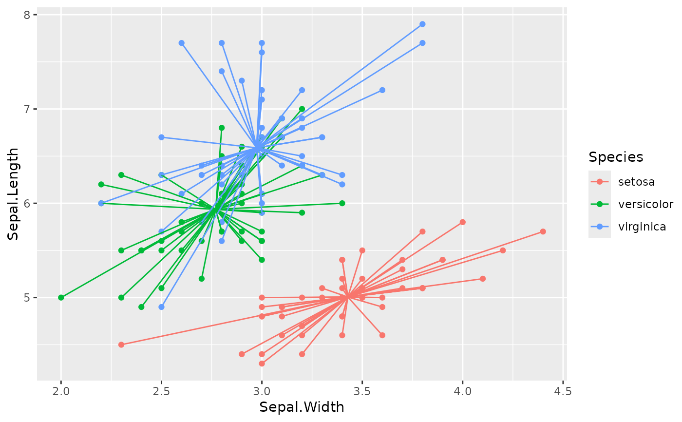 stat_centroid(aes(xend = Sepal.Width, yend = Sepal.Length),