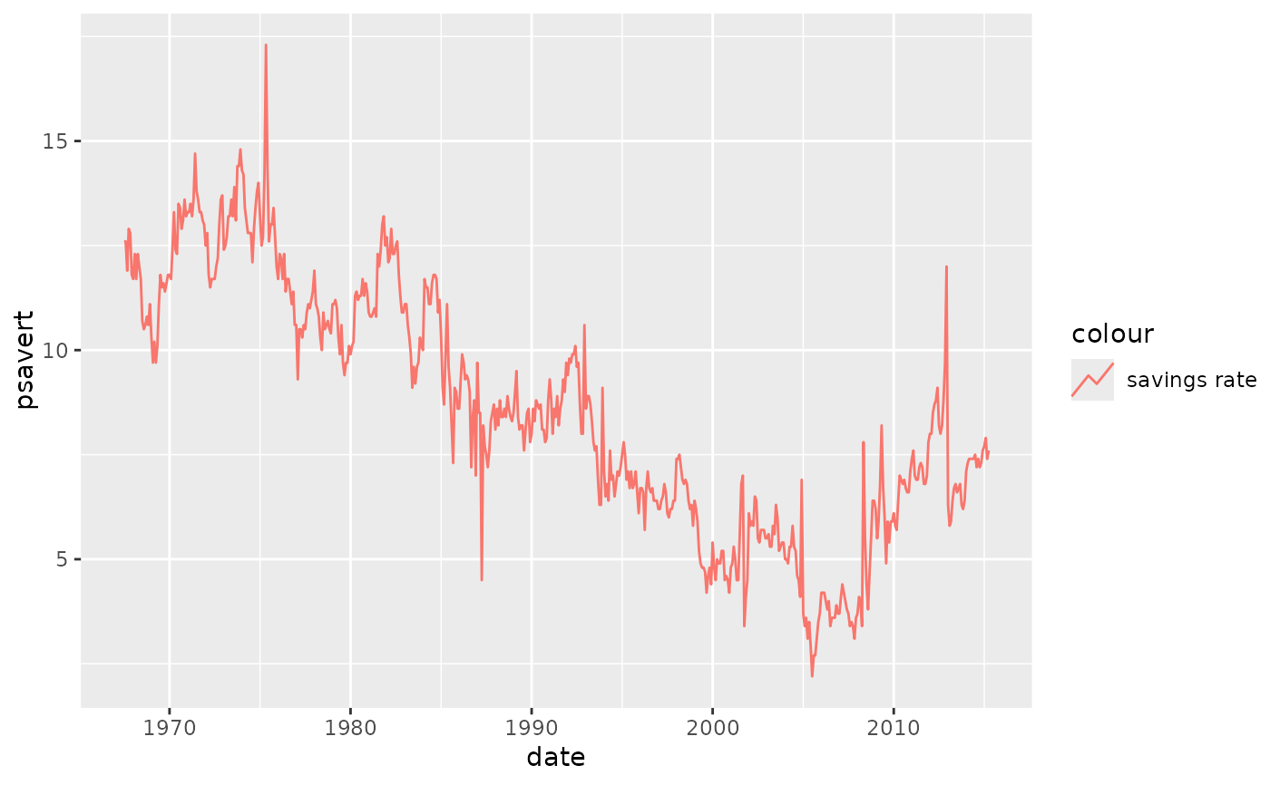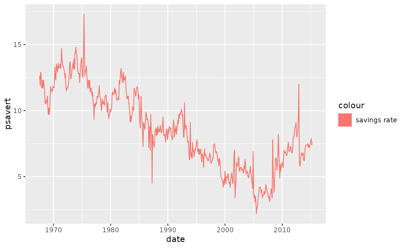 p <- ggplot(economics, aes(date, psavert, color = "savings rate"))