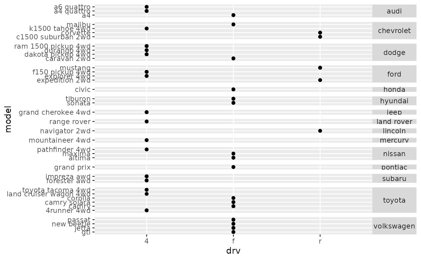 ggplot(mpg, aes(drv, model)) +