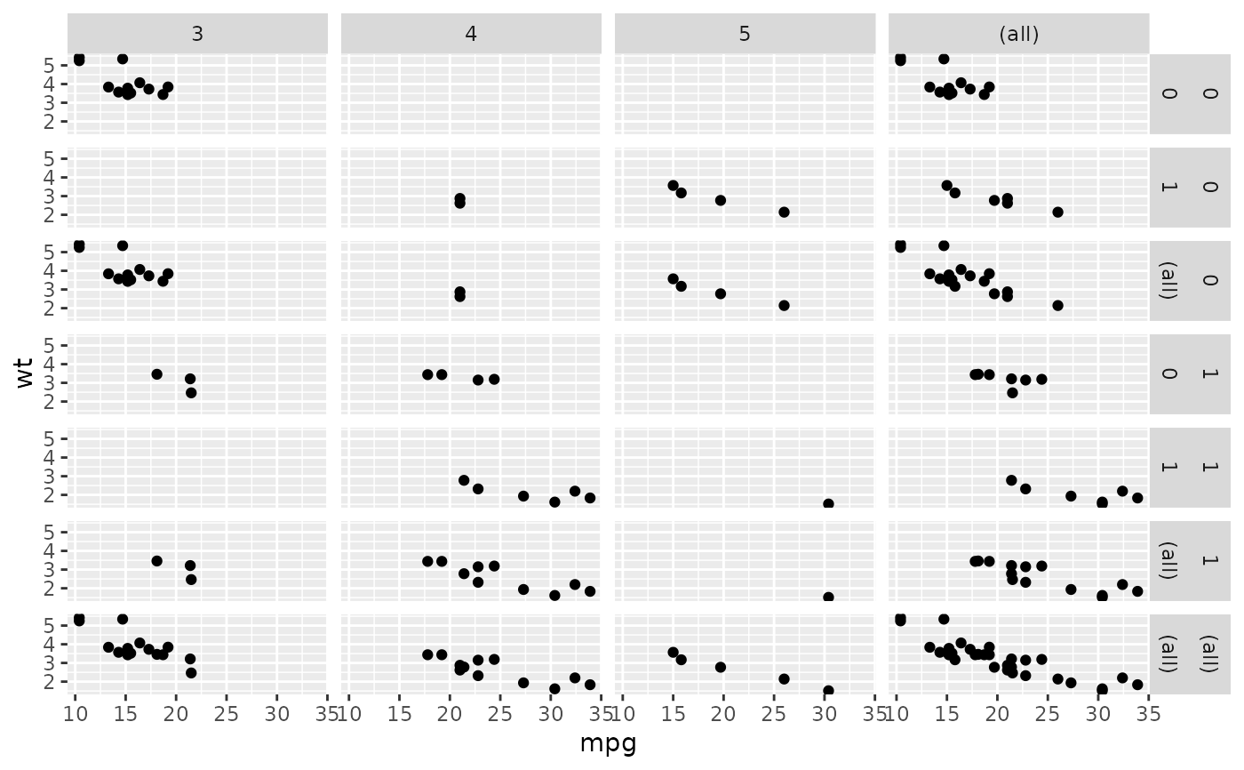 mg + facet_grid(vs + am ~ gear, margins = TRUE)