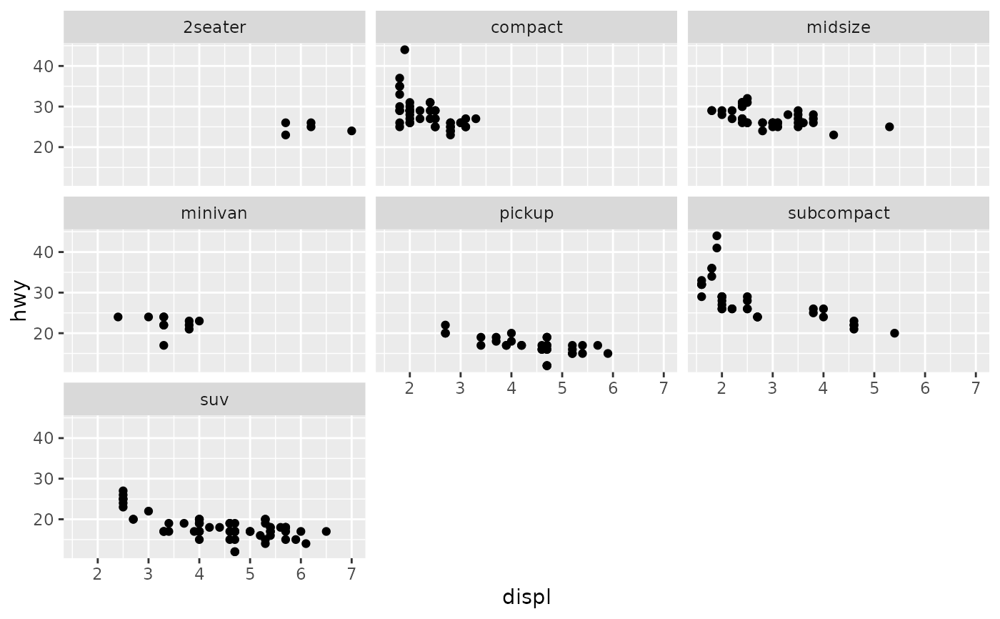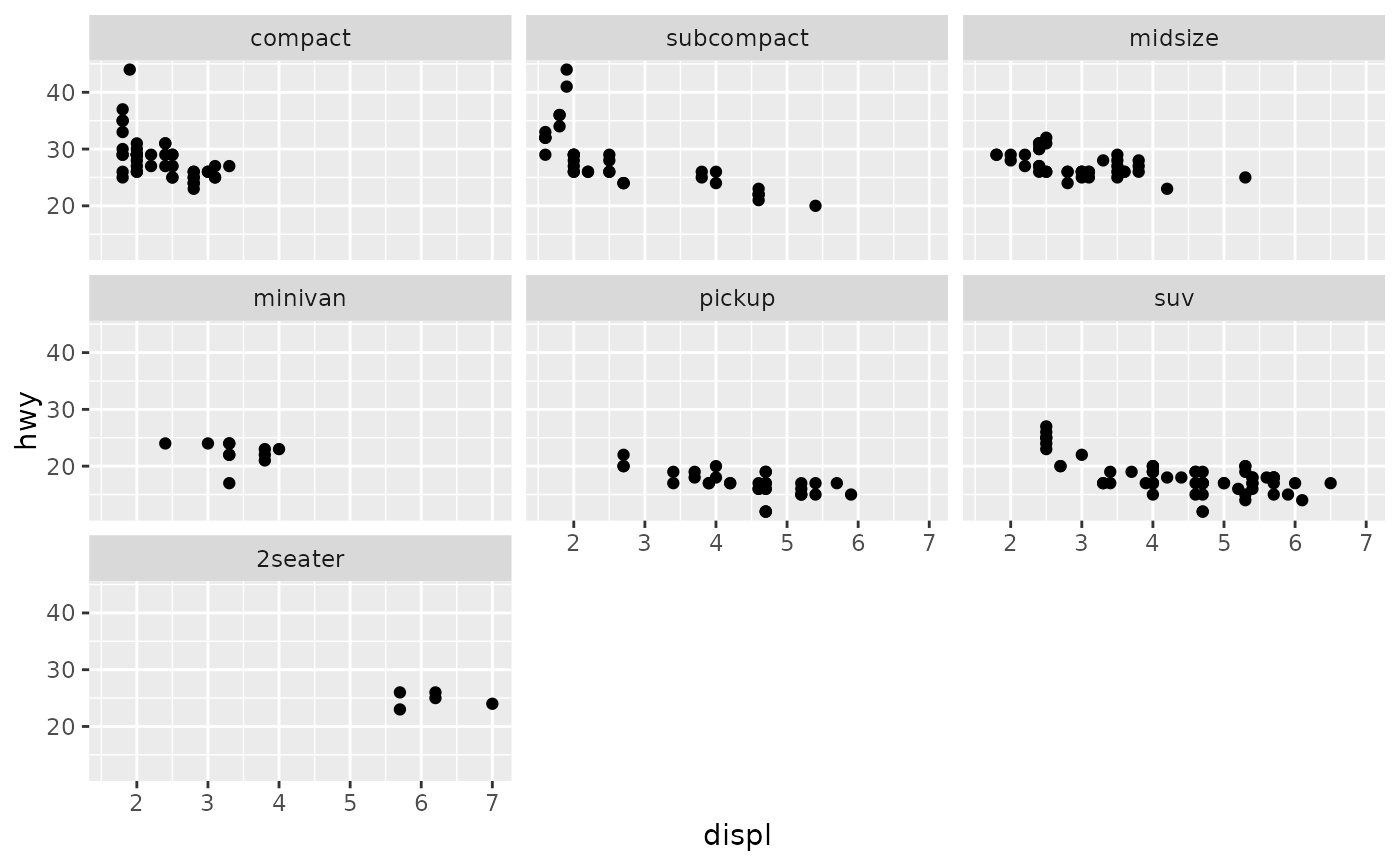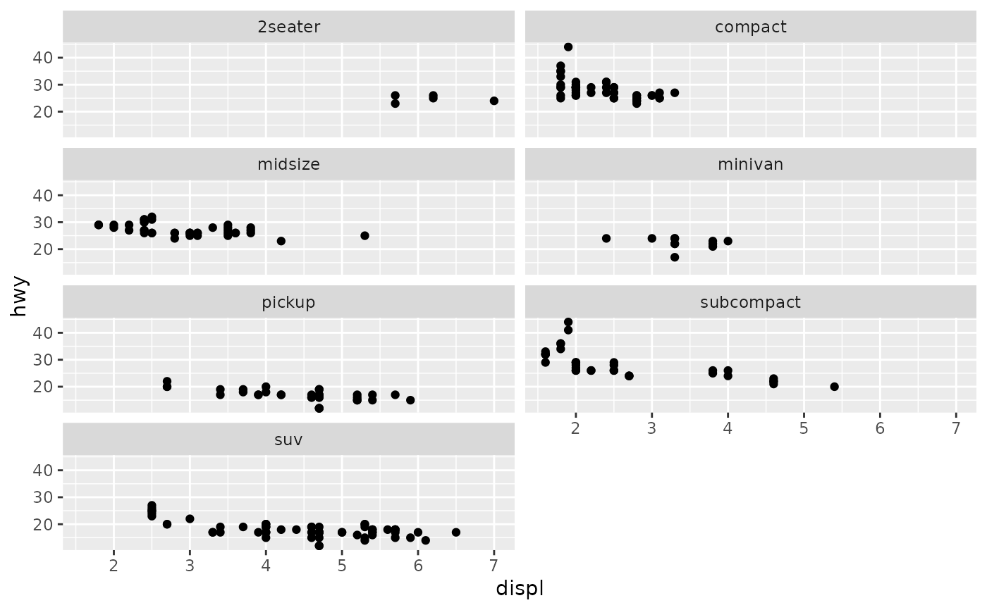 p <- ggplot(mpg, aes(displ, hwy)) + geom_point()
