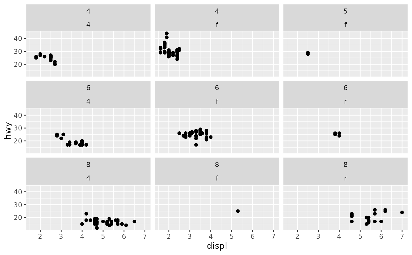 facet_wrap(vars(cyl, drv), labeller = "label_both")