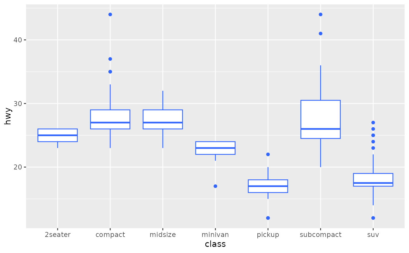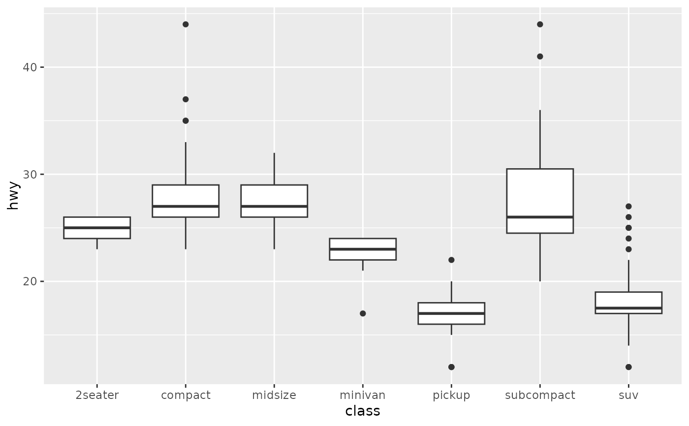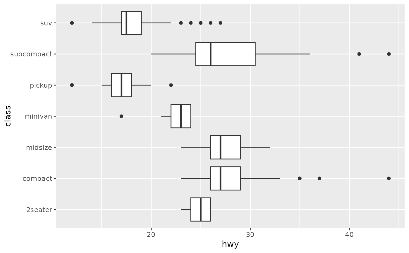 ggplot(mpg, aes(hwy, class)) + geom_boxplot()