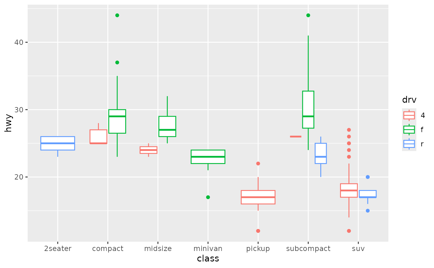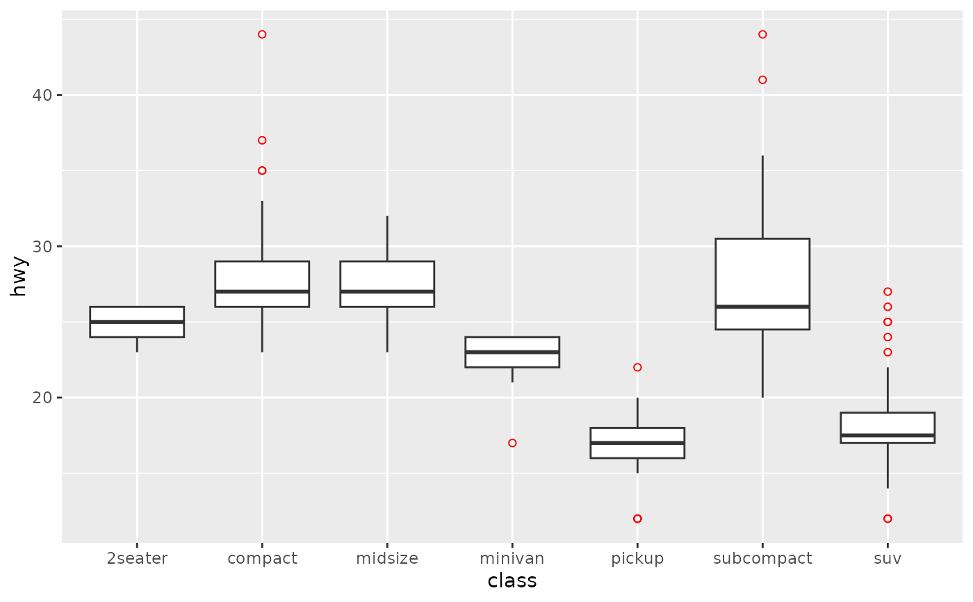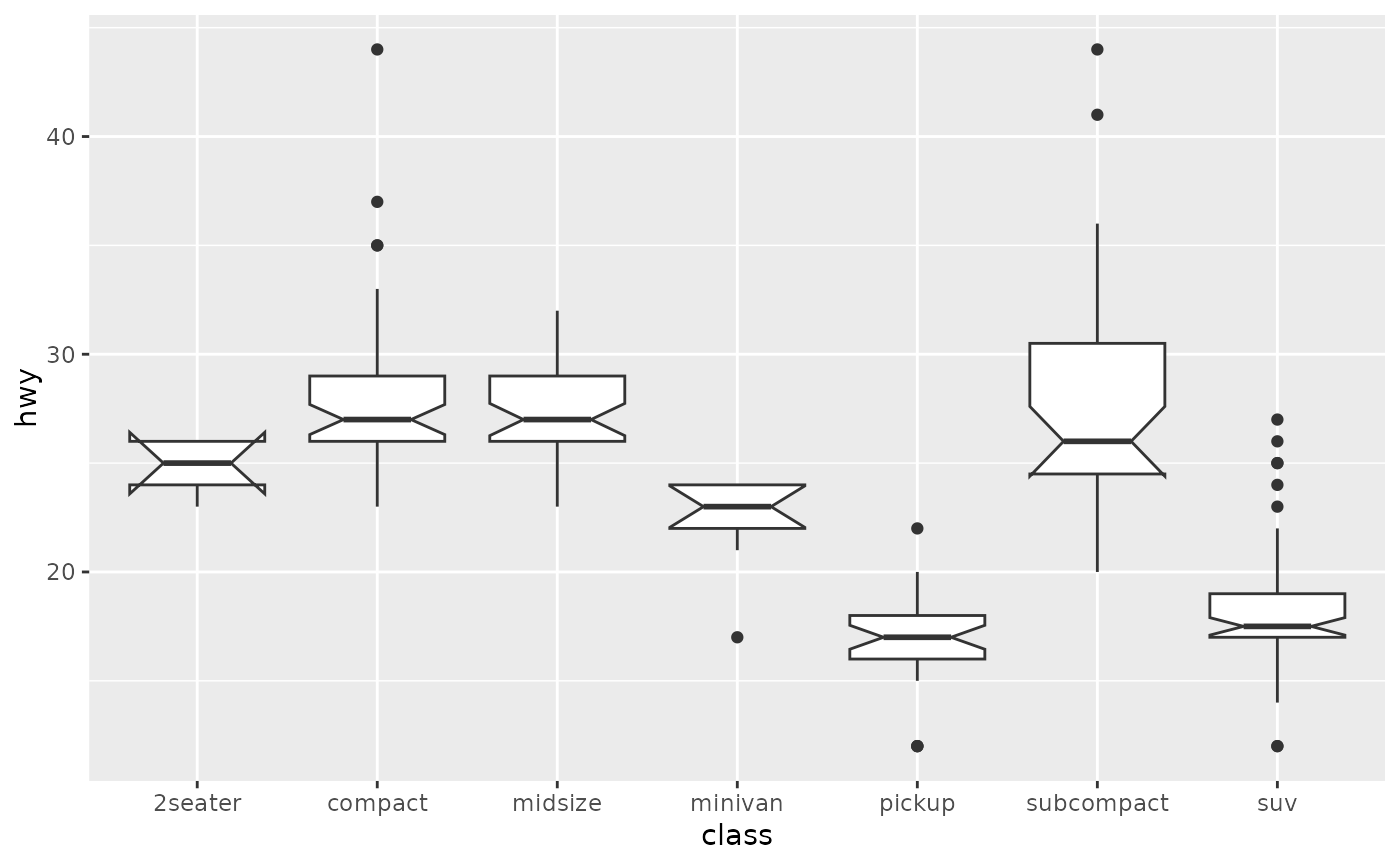 ggplot(mpg, aes(hwy, class)) + geom_boxplot()