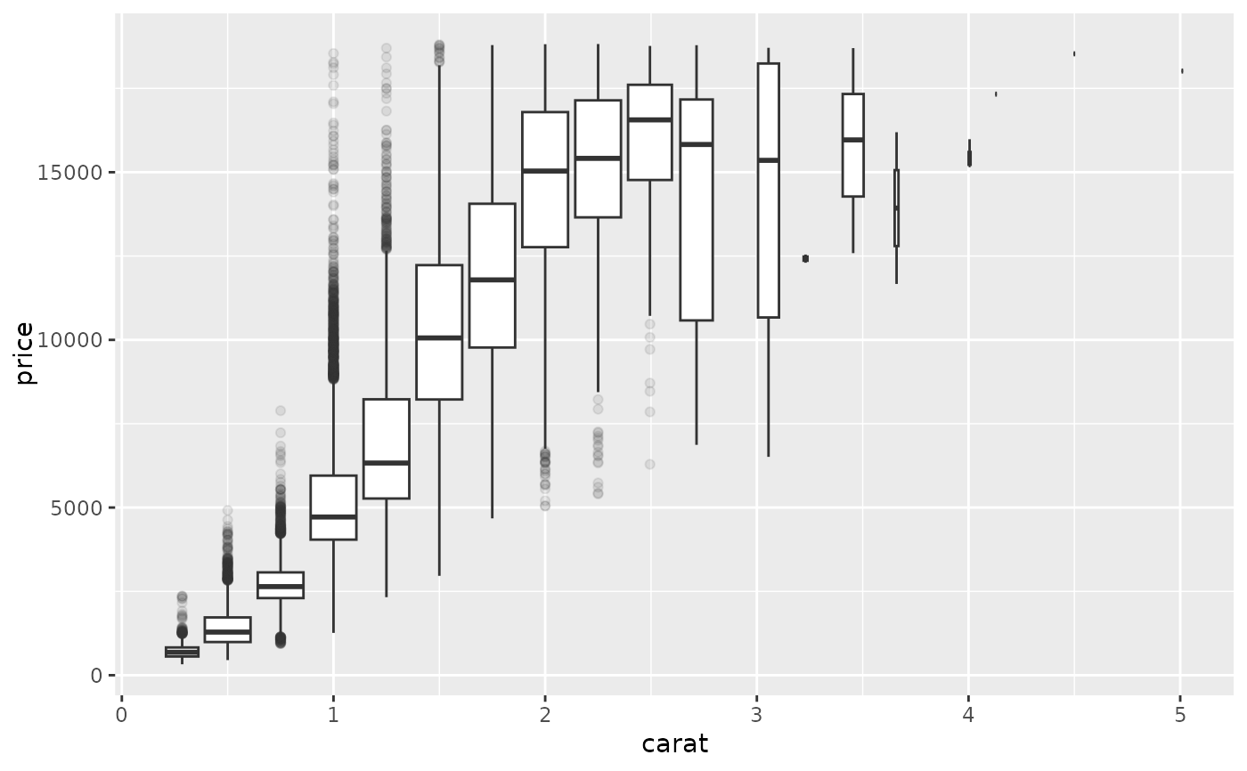 geom_boxplot(aes(group = cut_width(carat, 0.25)), outlier.alpha = 0.1)