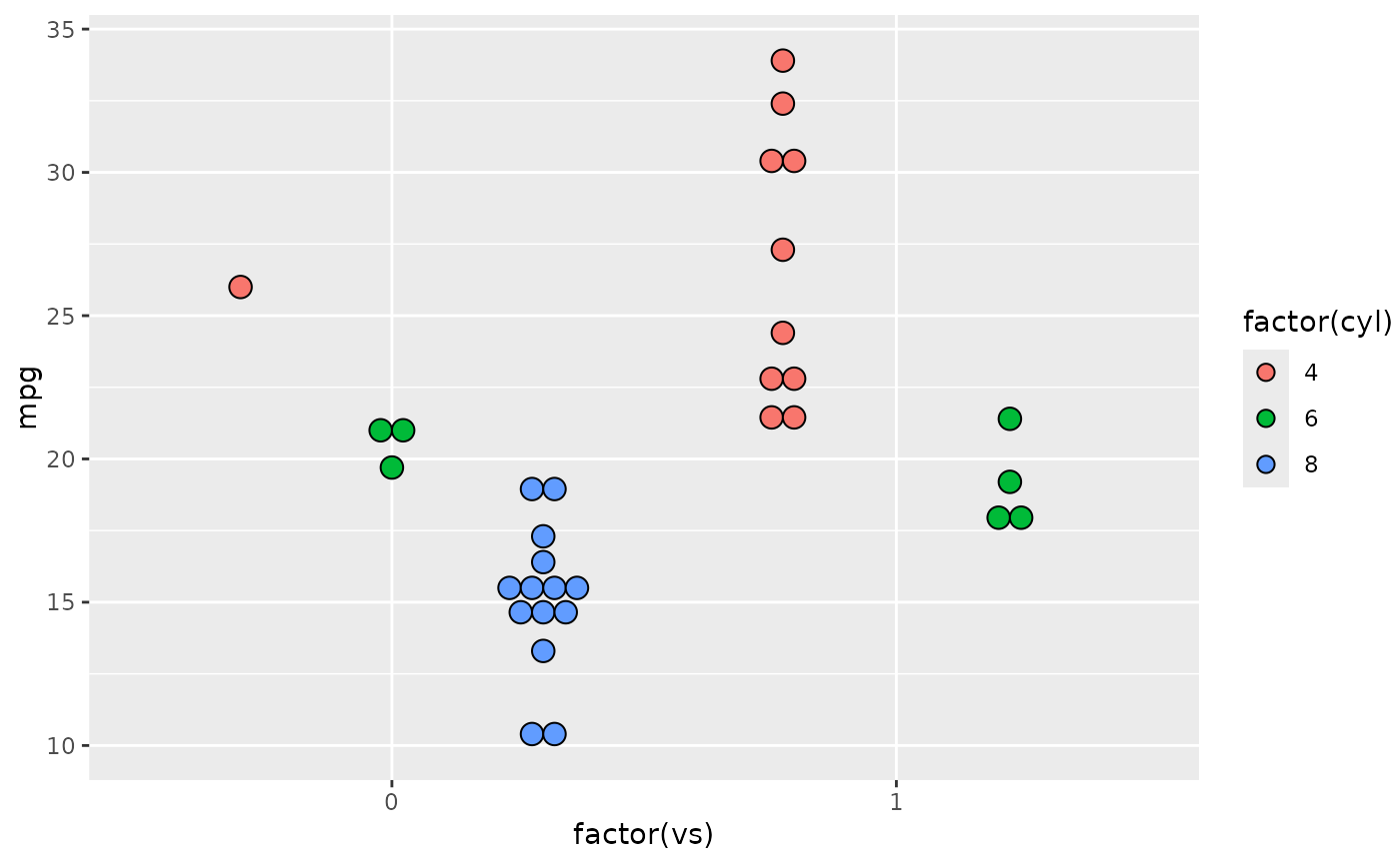 ggplot(mtcars, aes(x = factor(cyl), y = mpg)) +