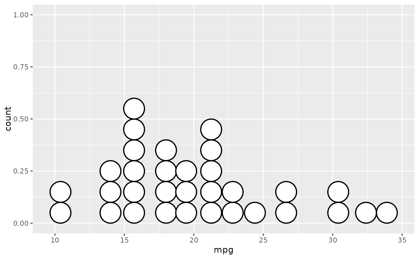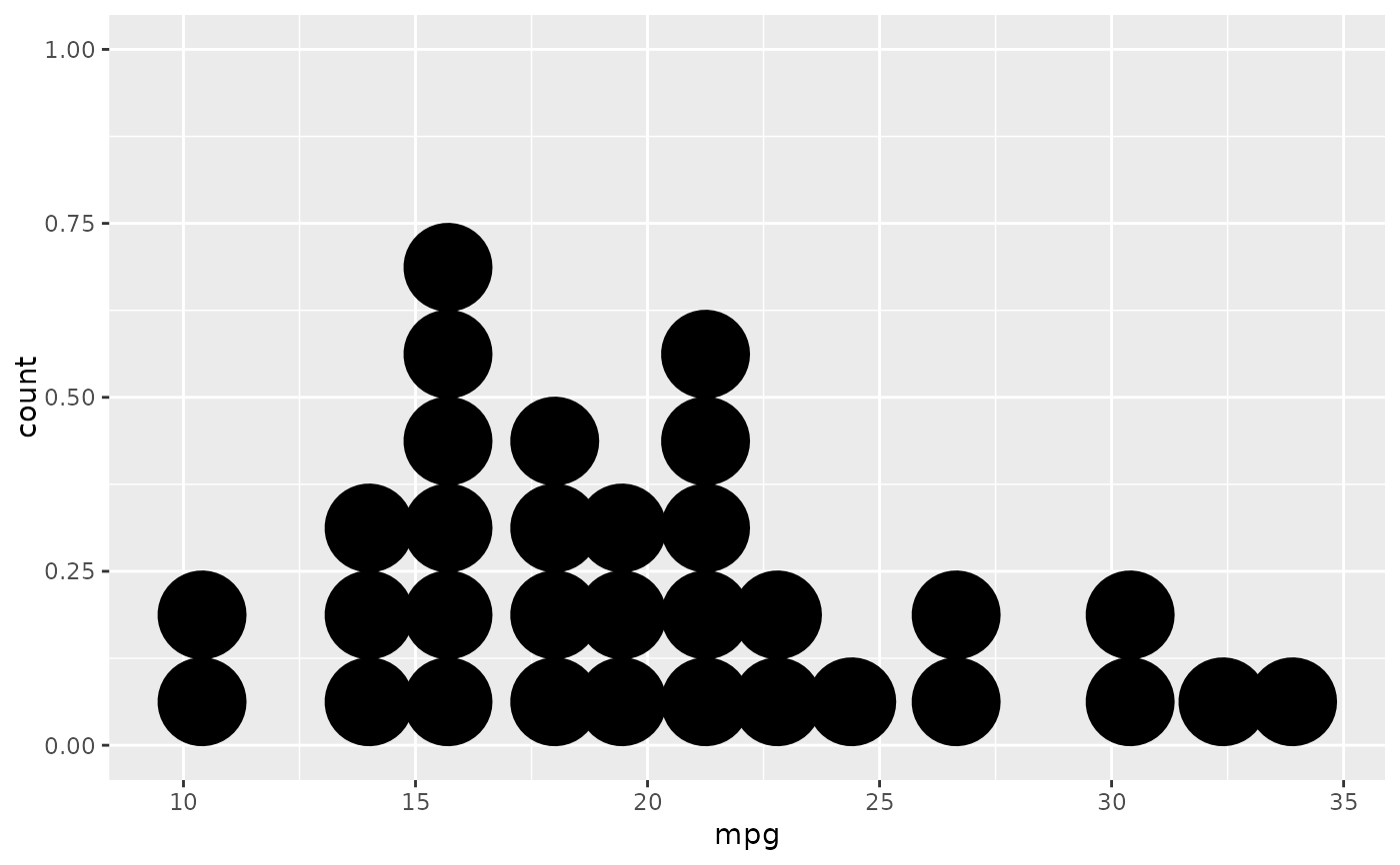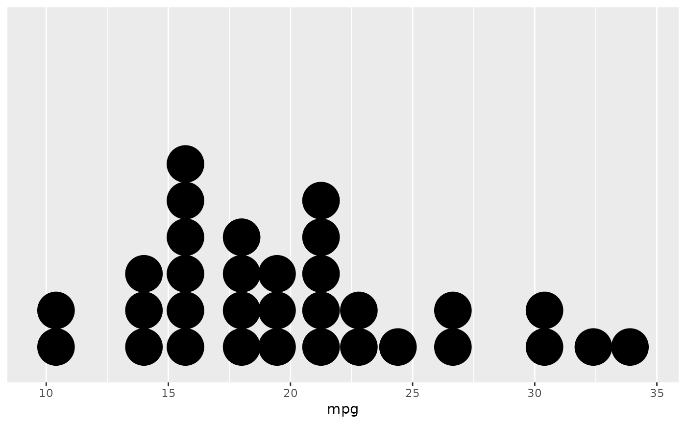 ggplot(mtcars, aes(x = mpg)) + geom_dotplot(binwidth = 1.5) +