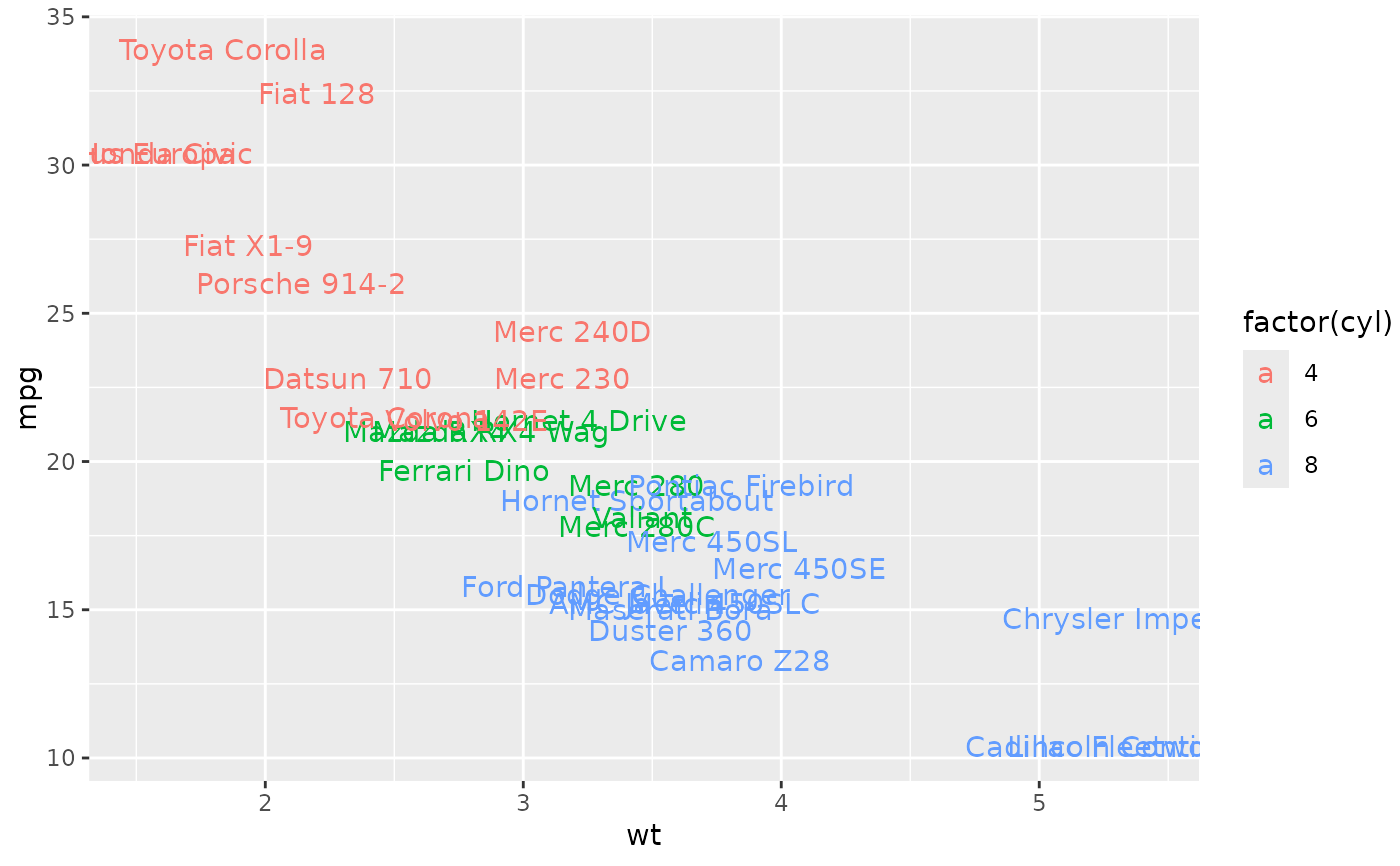 p <- ggplot(mtcars, aes(wt, mpg, label = rownames(mtcars)))