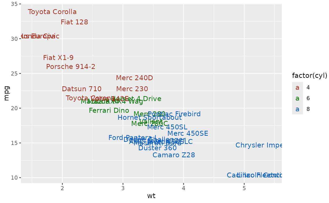 p + geom_text(aes(colour = factor(cyl)))