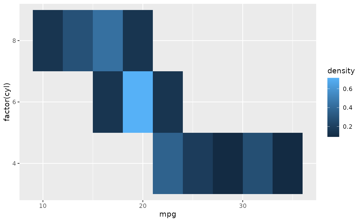 cars + stat_bin_2d(aes(fill = after_stat(density)), binwidth = c(3,1))