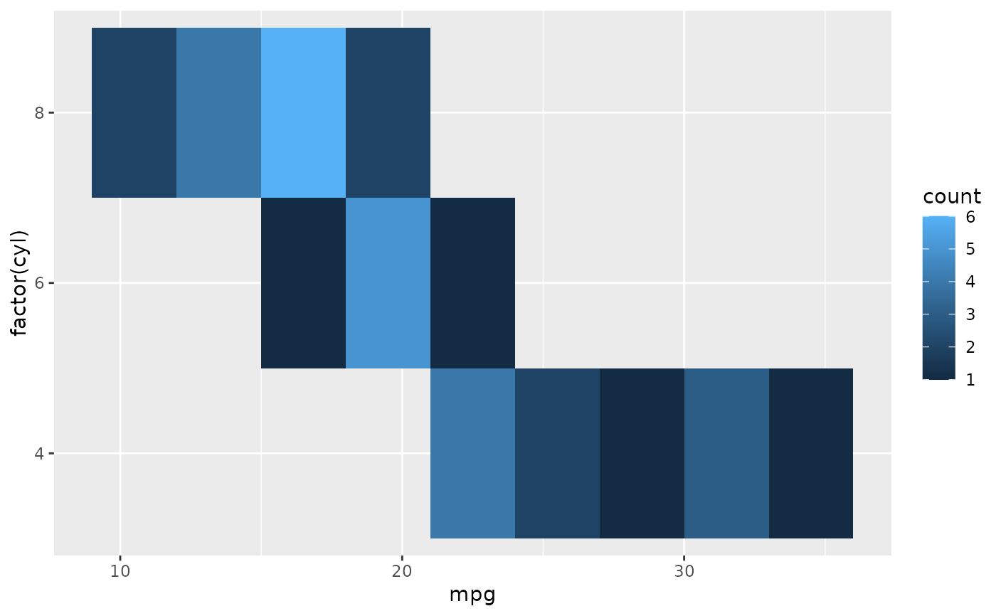 cars + stat_bin_2d(aes(fill = after_stat(count)), binwidth = c(3,1))