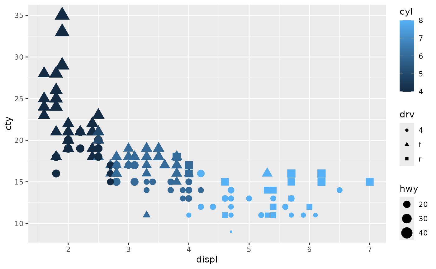 geom_point(aes(size = hwy, colour = cyl, shape = drv)) +