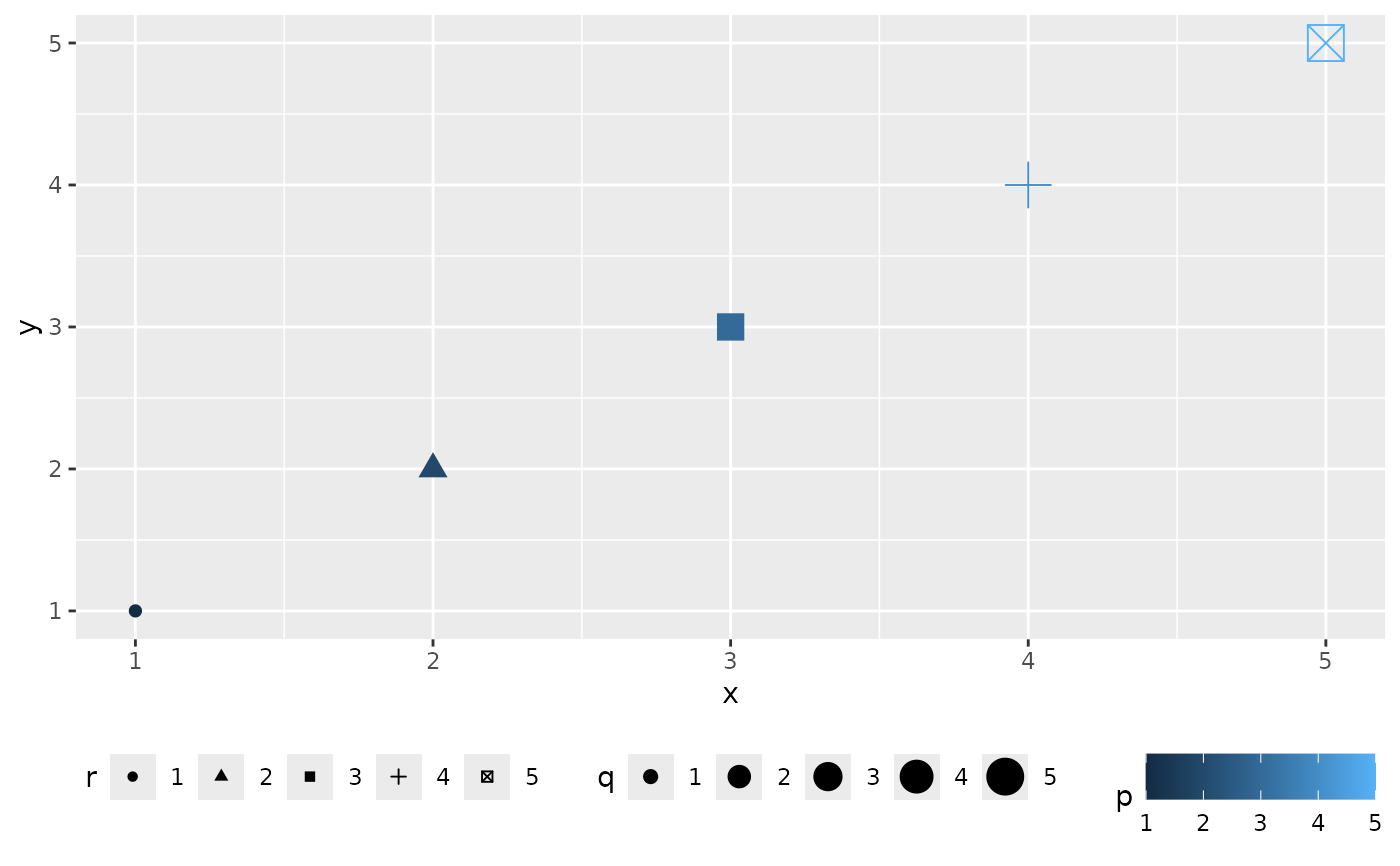 ggplot(dat, aes(x, y, colour = p, size = q, shape = r)) +