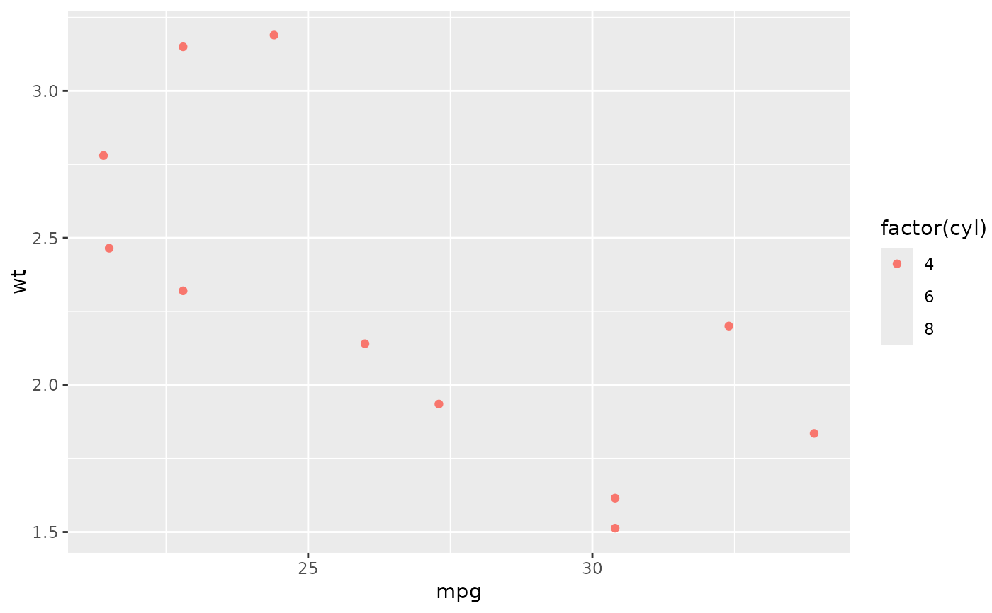 ggplot(small, aes(mpg, wt, colour = factor(cyl))) +