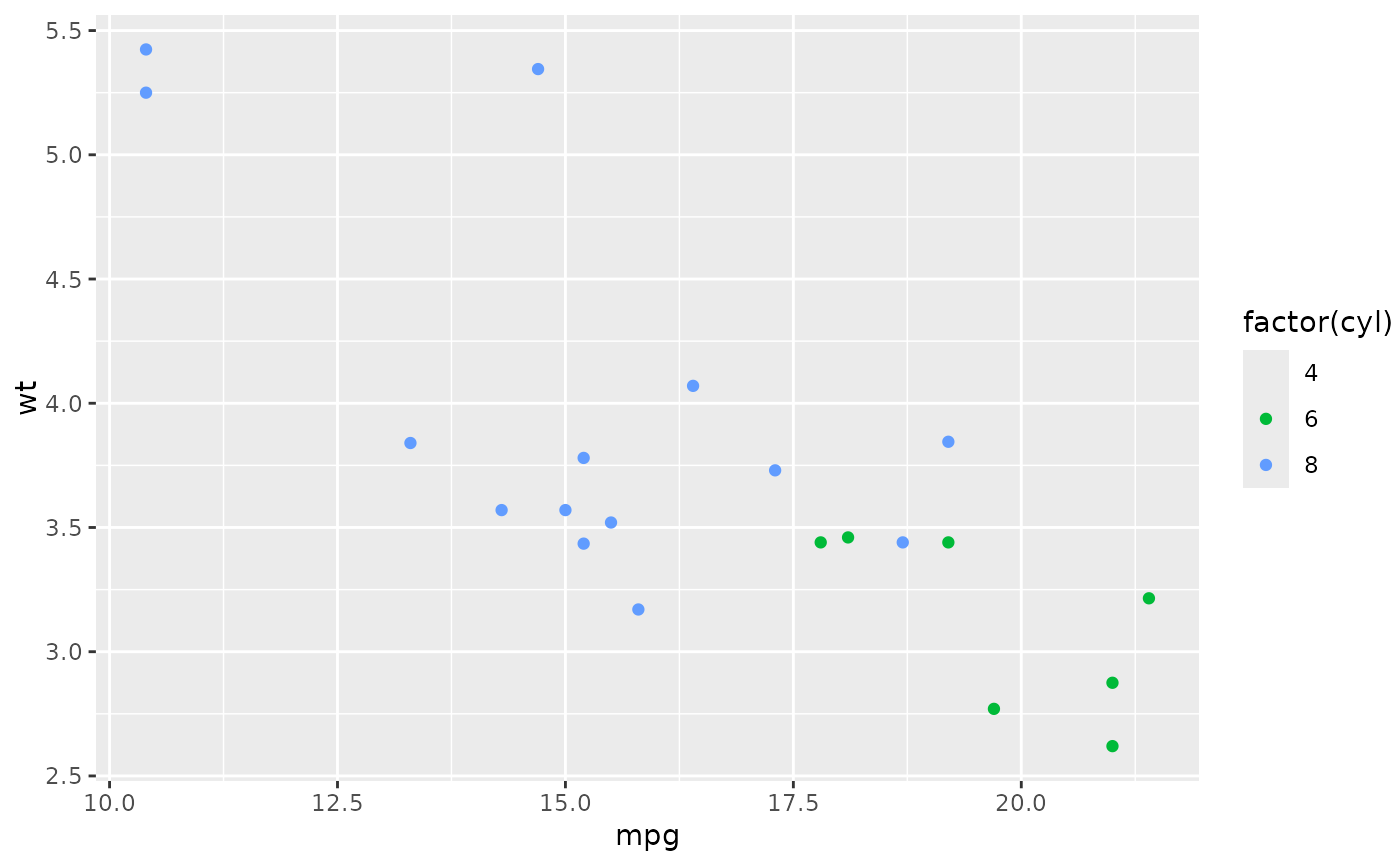 ggplot(big, aes(mpg, wt, colour = factor(cyl))) +