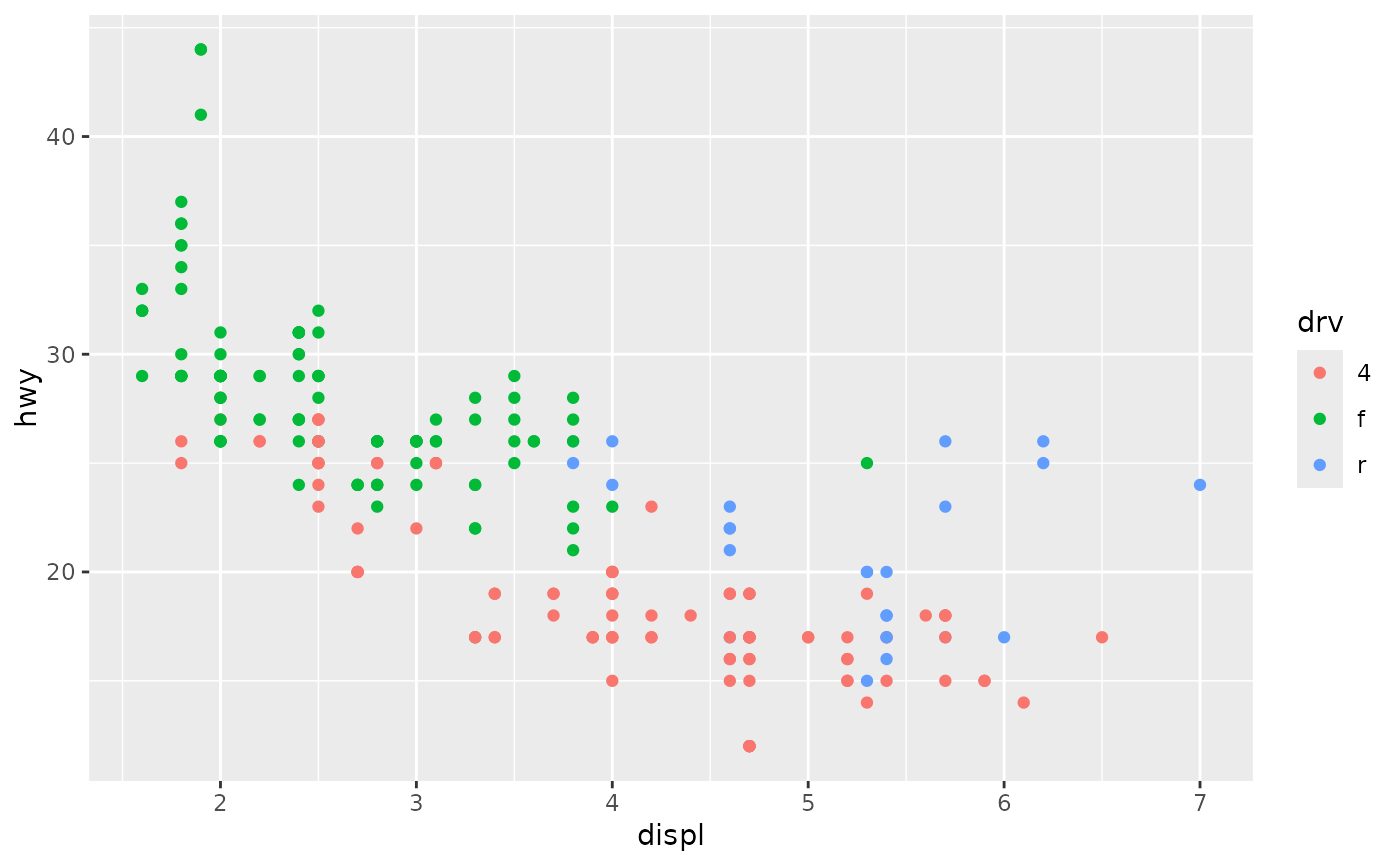 print(ggplot(mpg, aes_(~ displ, ~ hwy, colour = colour)) +