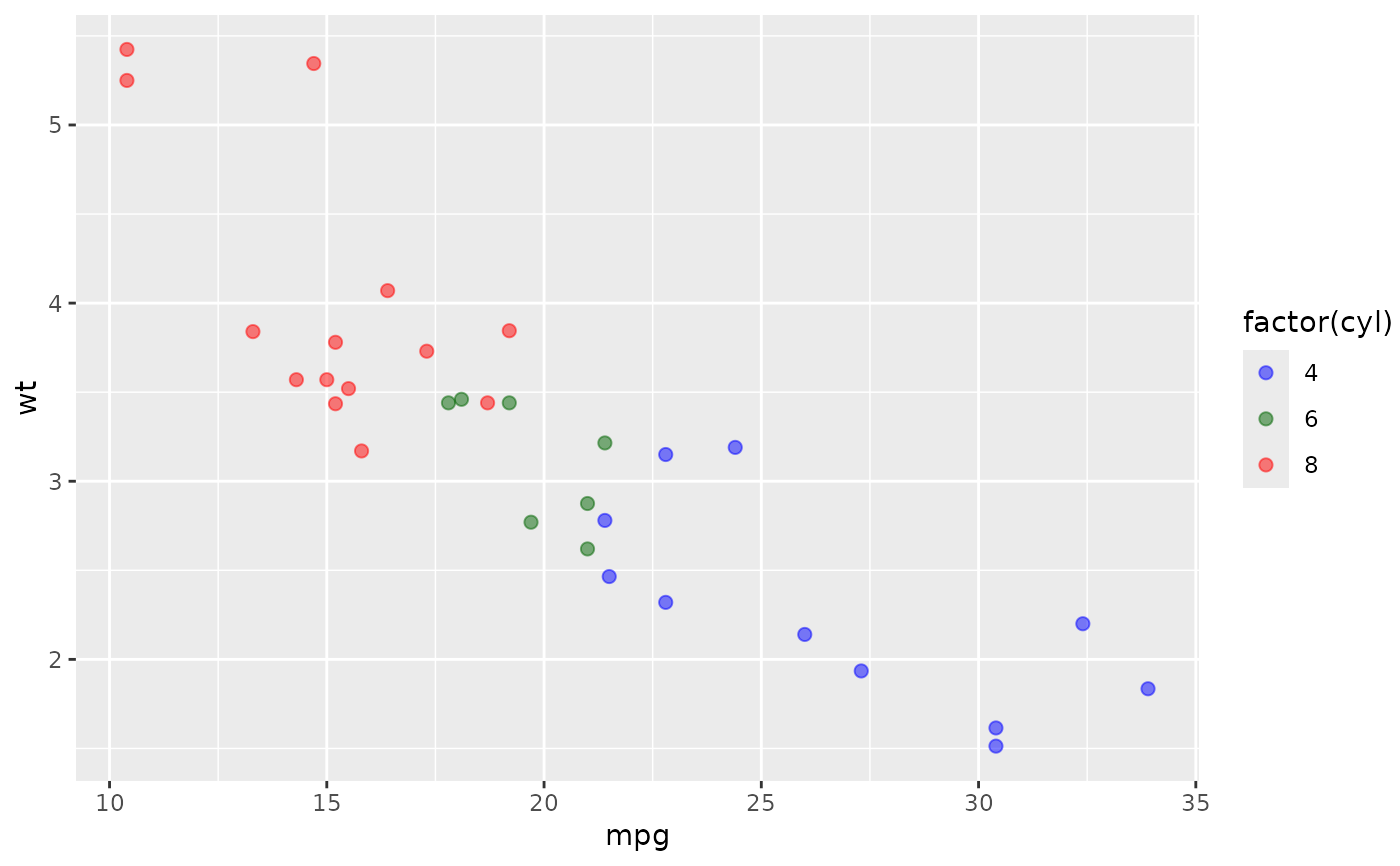 aes(mpg, wt, colour = factor(cyl), fill = factor(cyl))