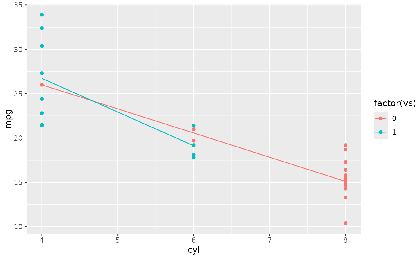 d + aes(colour = factor(vs)) + stat_summary(fun = mean, geom="line")