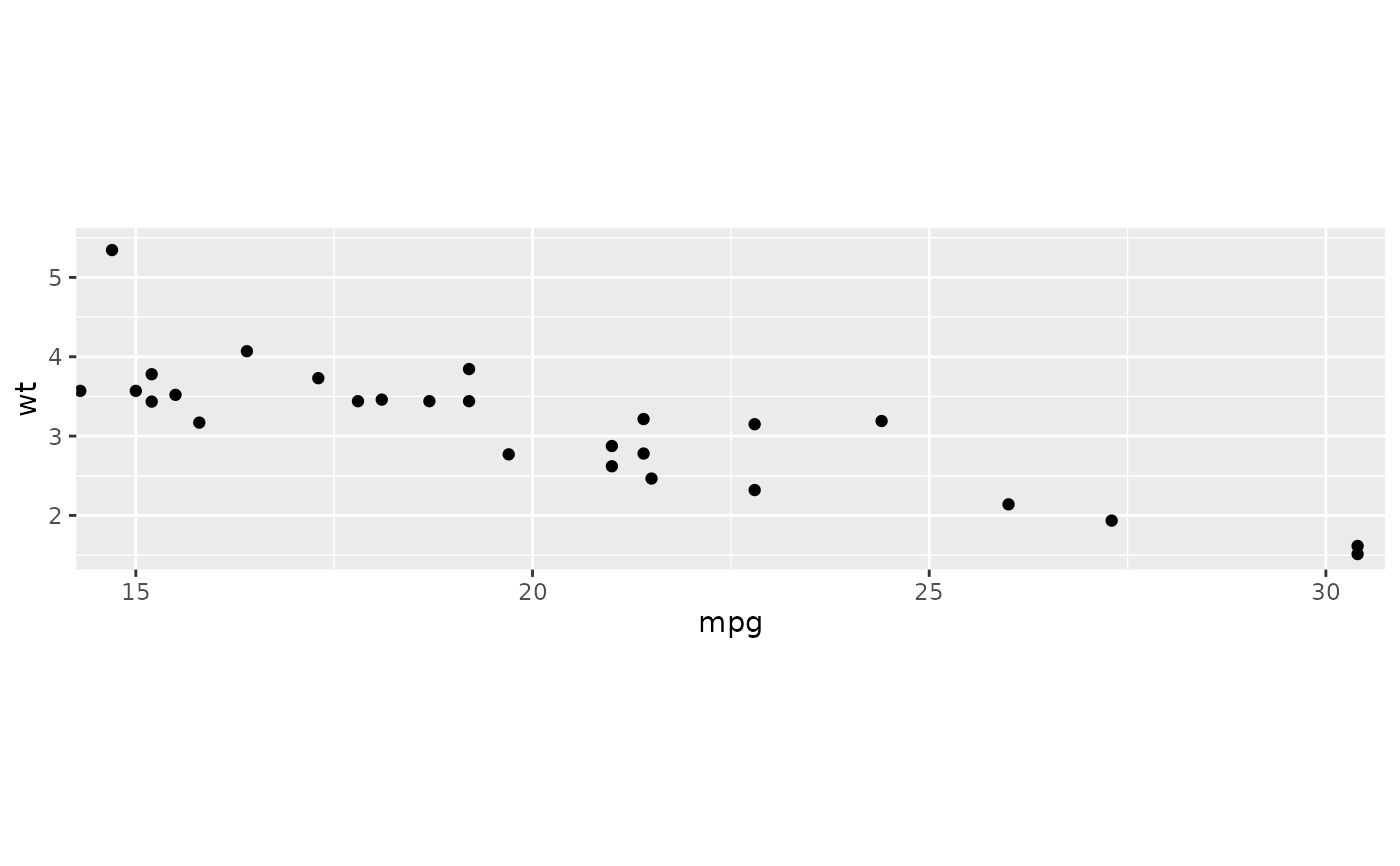 coord_fixed(ratio = 1, ...)aspect ratio, expressed as y / x. Can be NULL (default) to