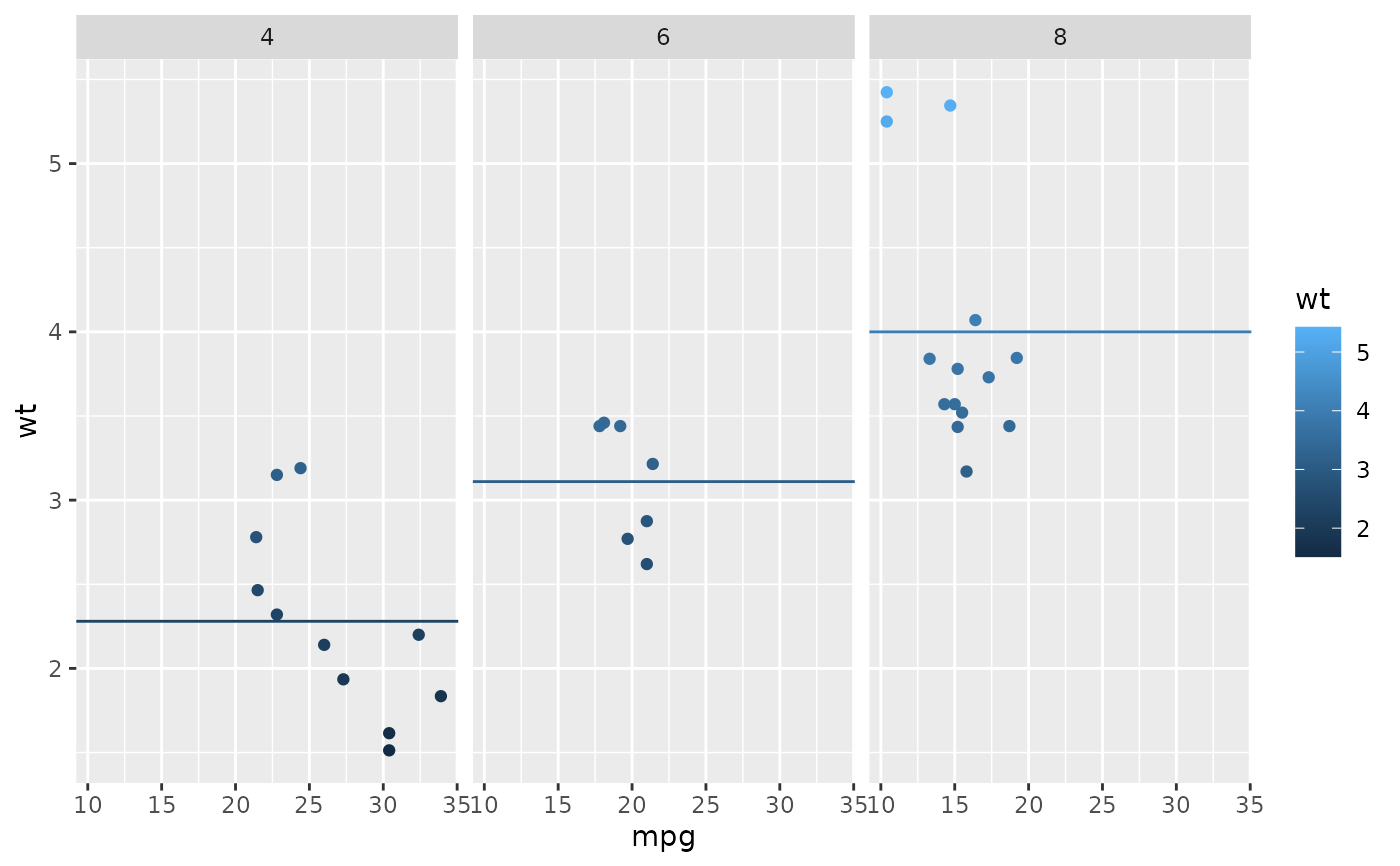 geom_hline(aes(yintercept = wt, colour = wt), mean_wt) +