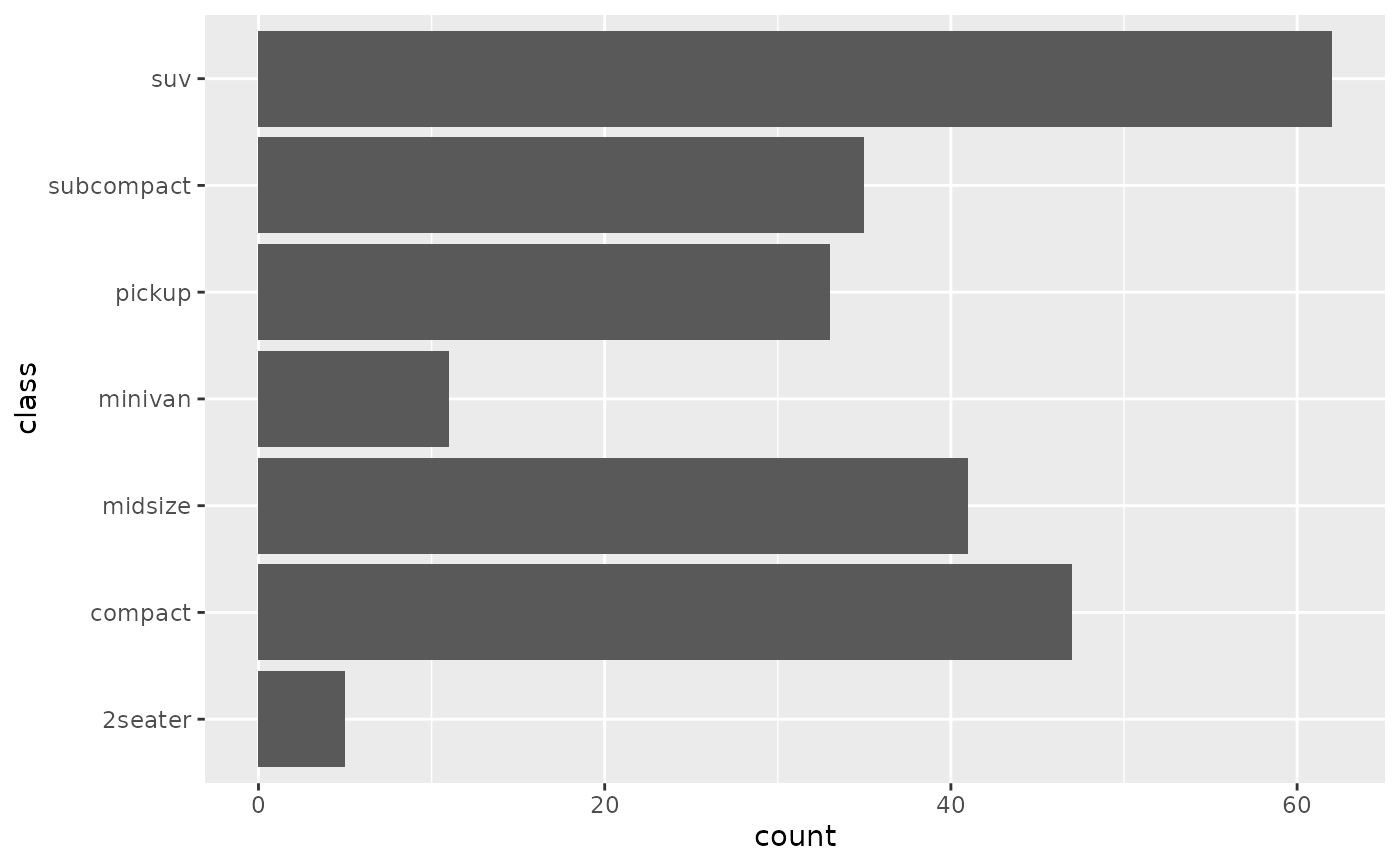 ggplot(mpg) + geom_bar(aes(y = class))