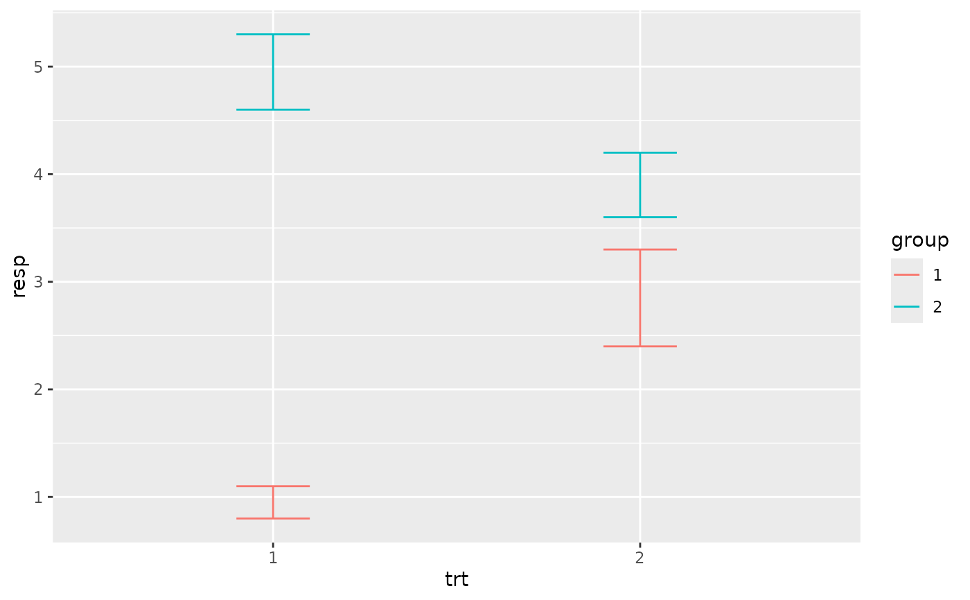 p <- ggplot(df, aes(trt, resp, colour = group))