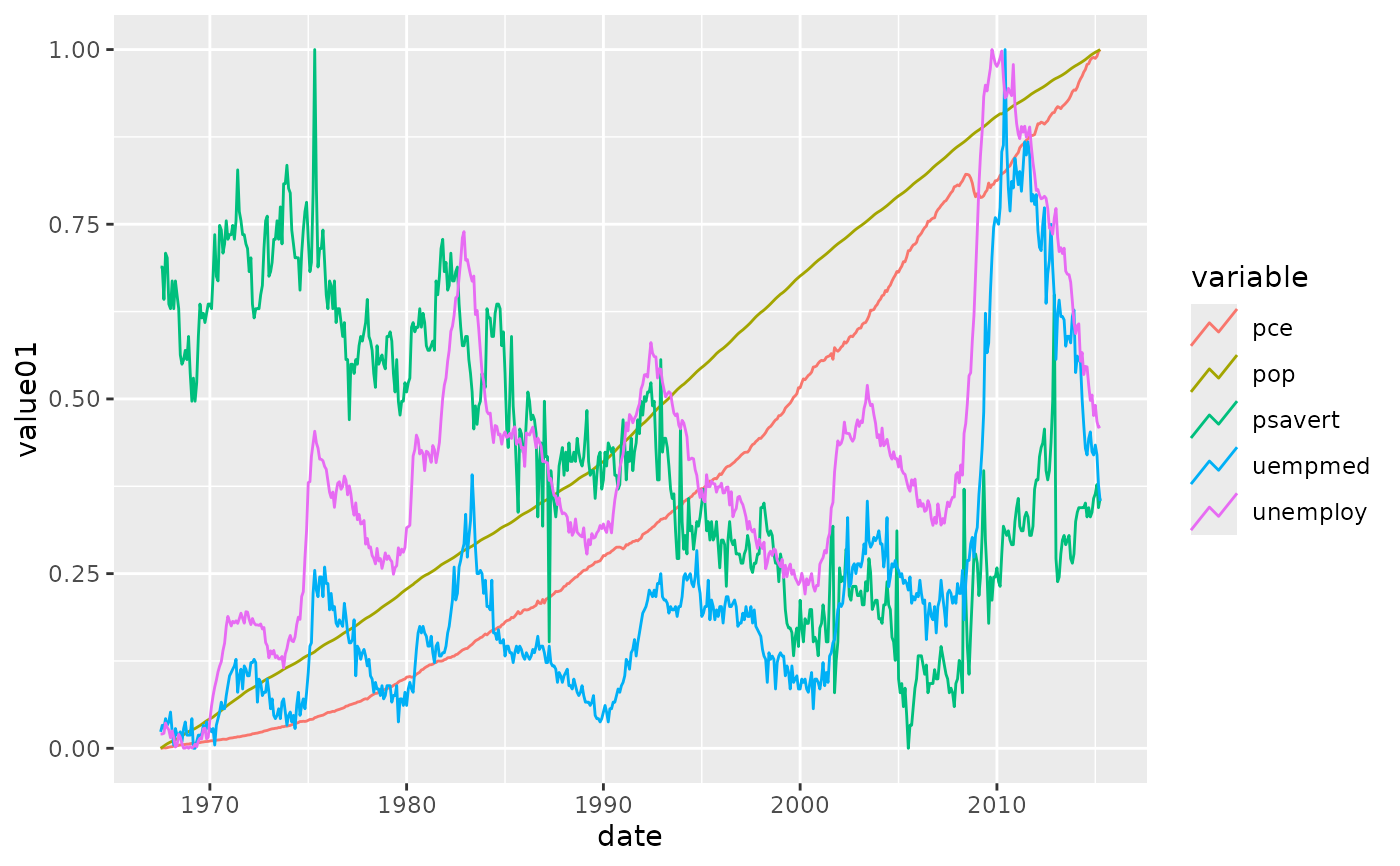 ggplot(economics_long, aes(date, value01, colour = variable)) +