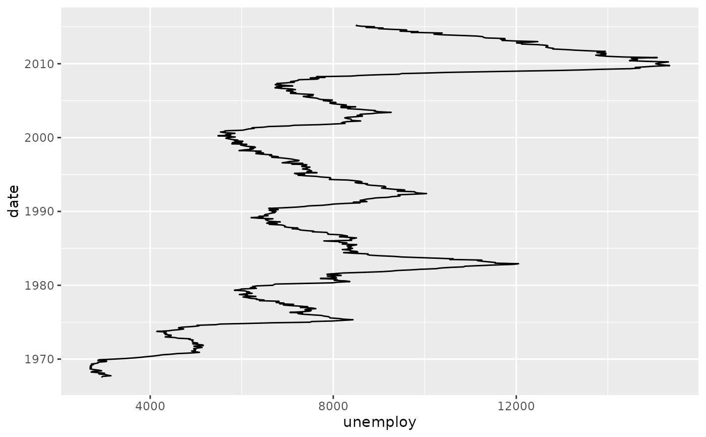 ggplot(economics, aes(unemploy, date)) + geom_line(orientation = "y")