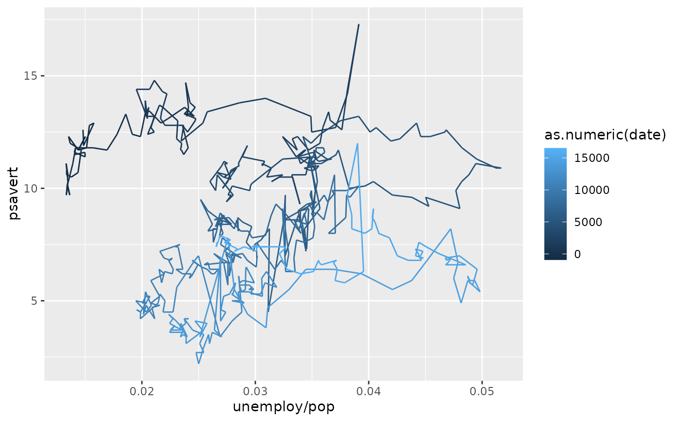m <- ggplot(economics, aes(unemploy/pop, psavert))