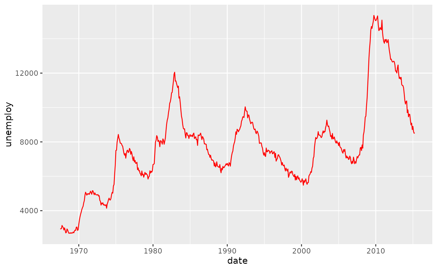 ggplot(economics, aes(date, unemploy)) + geom_line()