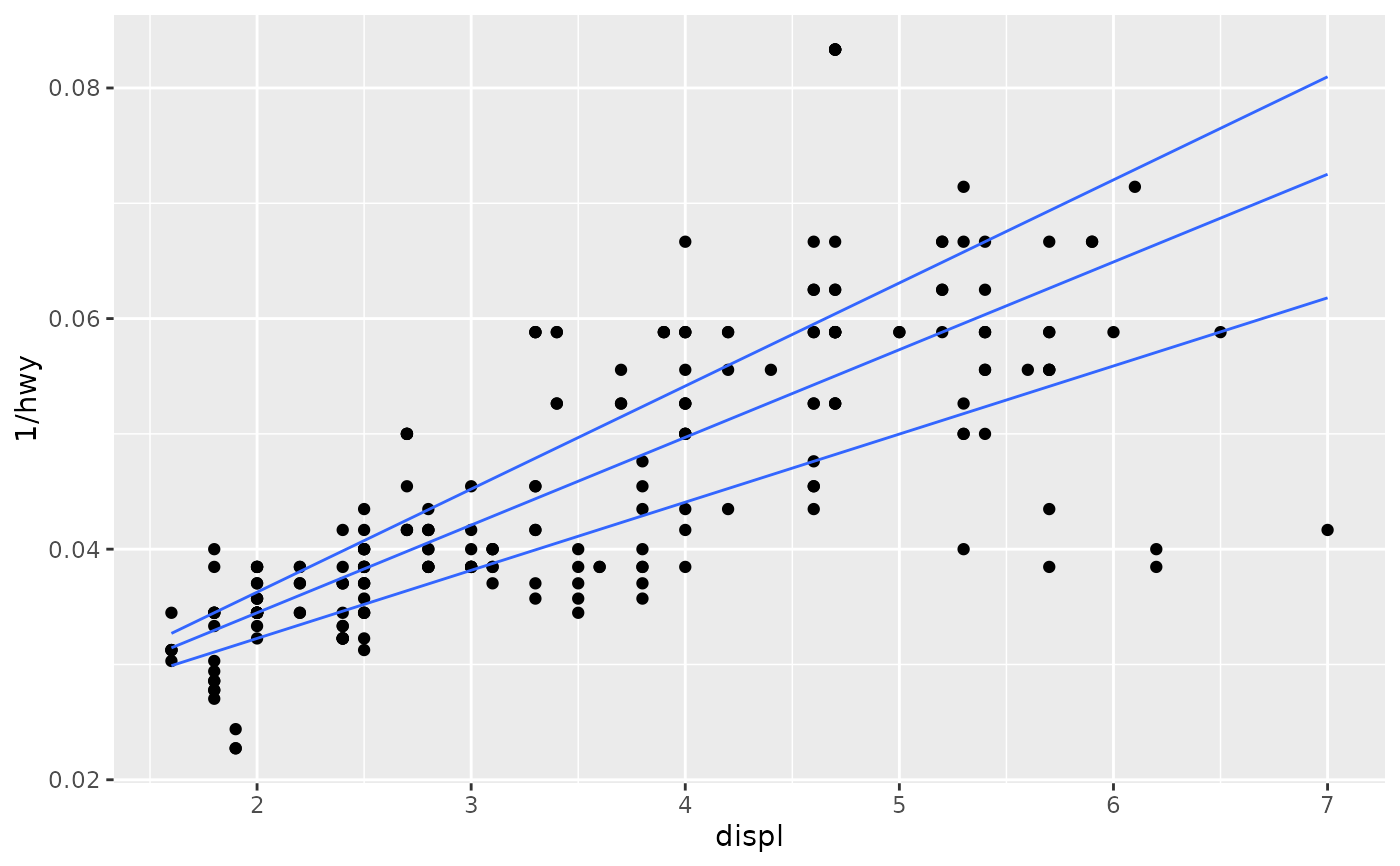 ggplot(mpg, aes(displ, 1 / hwy)) +
