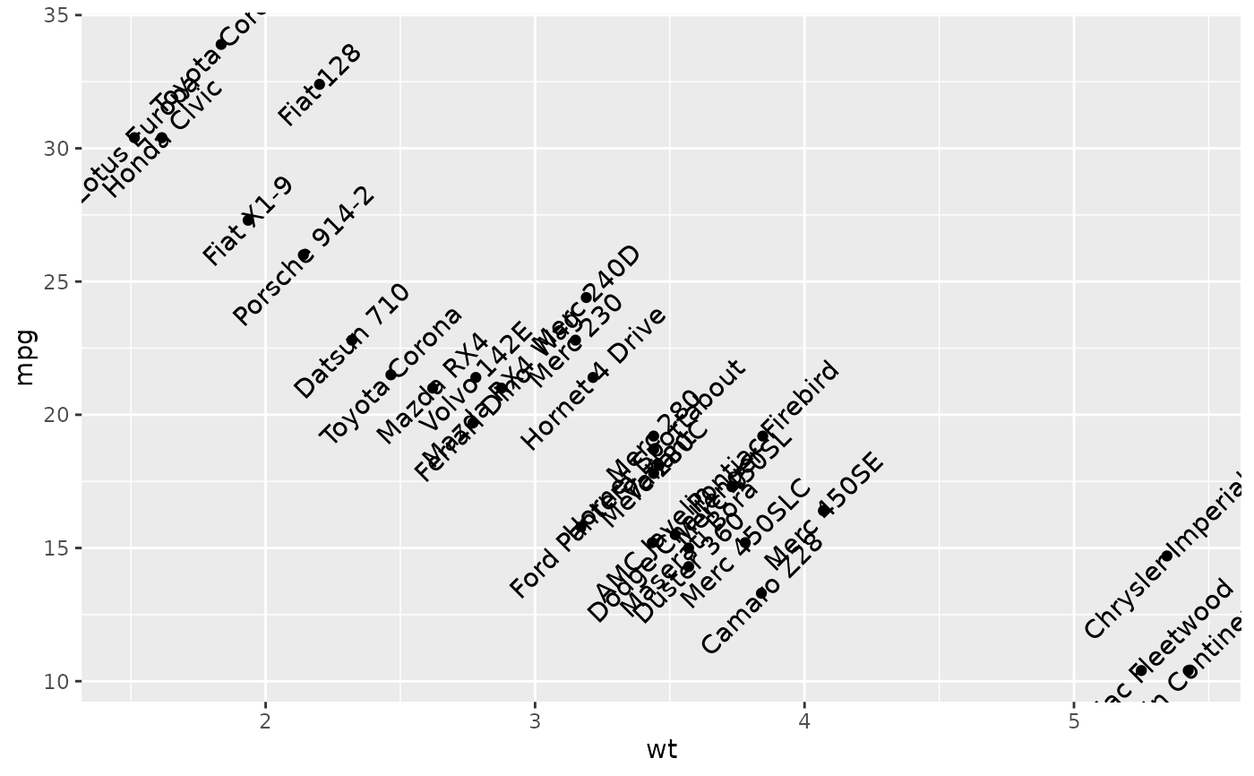 p <- ggplot(mtcars, aes(wt, mpg, label = rownames(mtcars)))