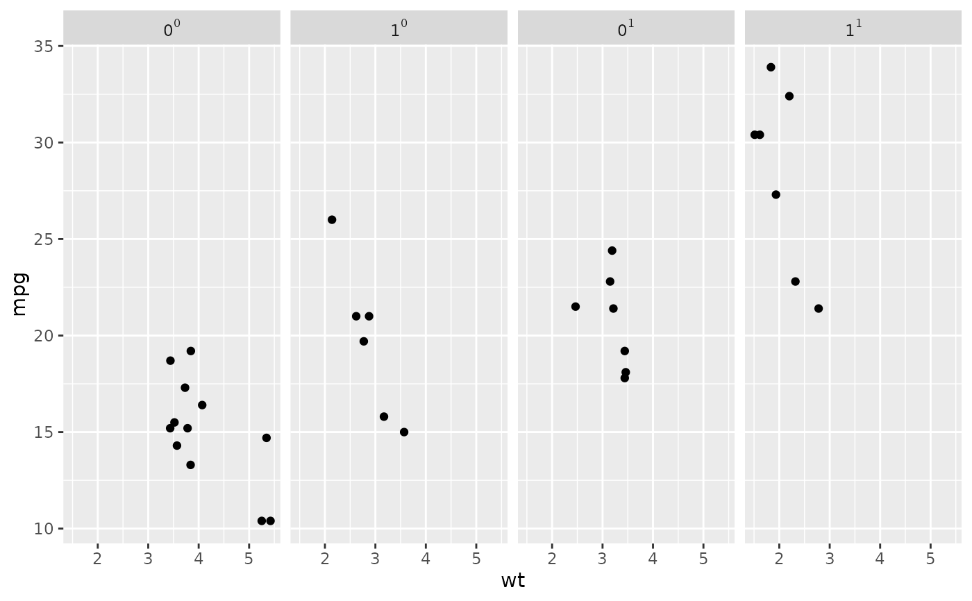p + facet_grid(. ~ vs + am, labeller = label_bquote(cols = .(am) ^ .(vs)))