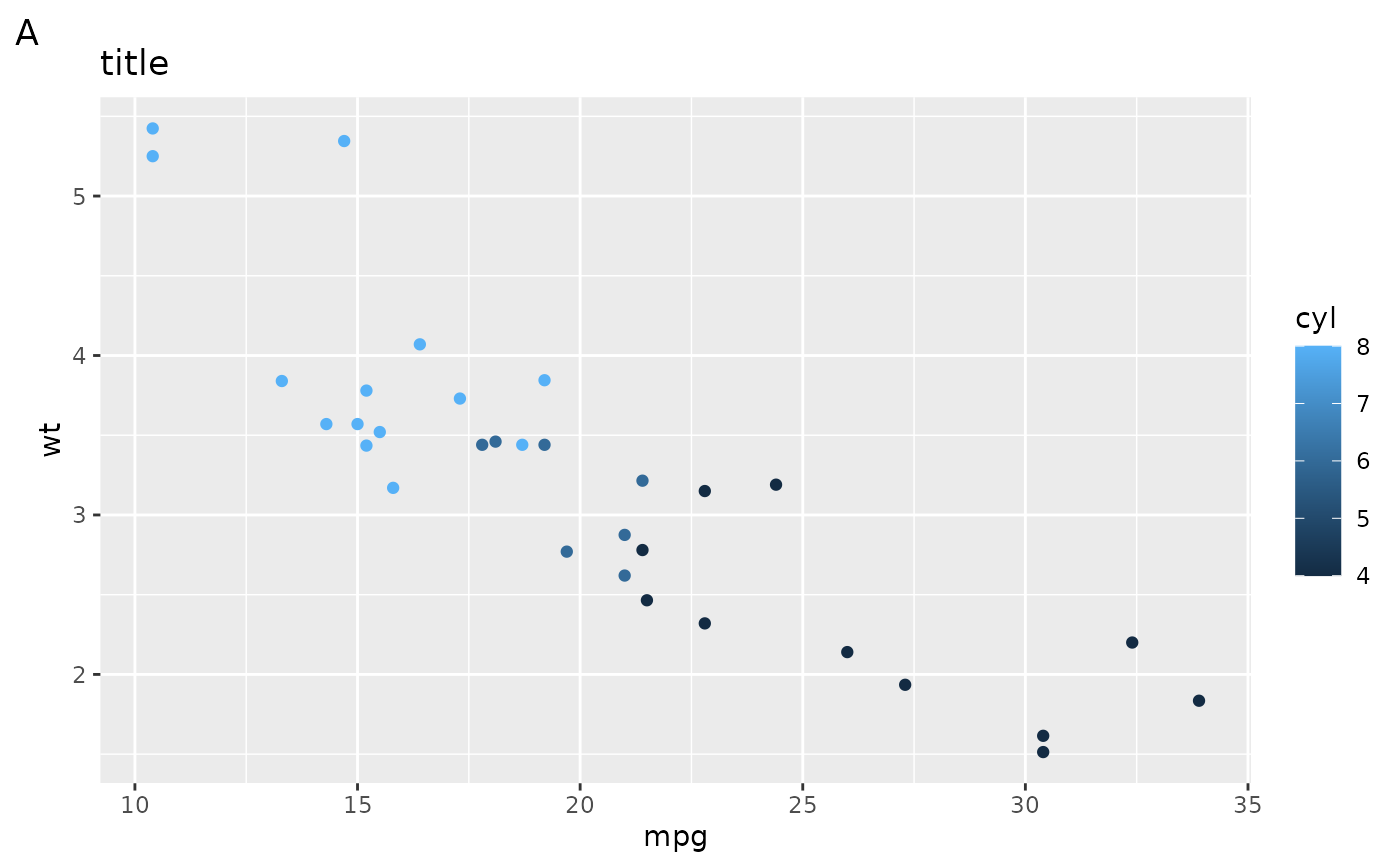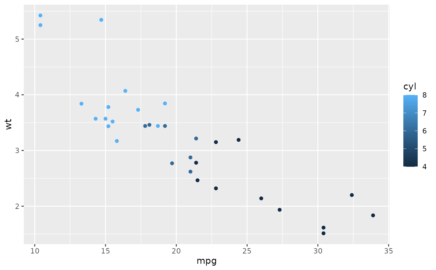 p <- ggplot(mtcars, aes(mpg, wt, colour = cyl)) + geom_point()